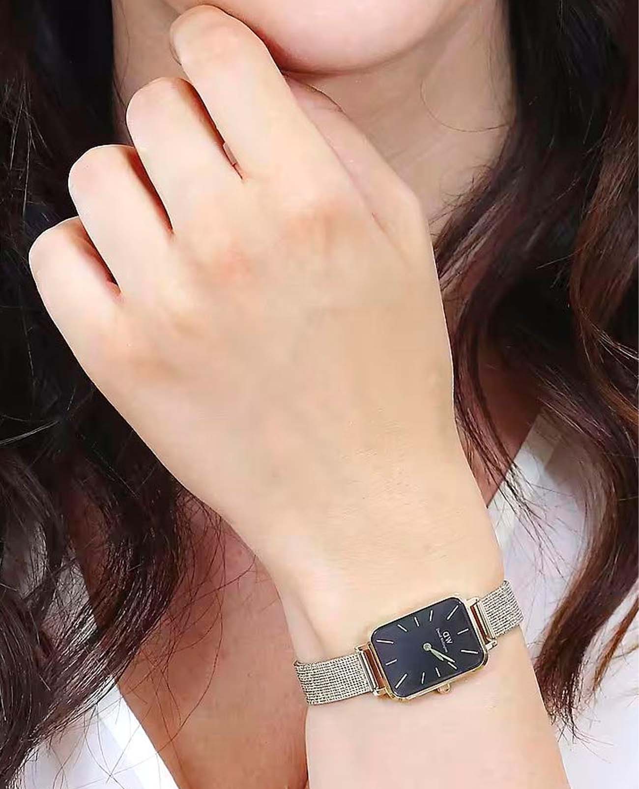 Женские наручные часы с минеральным стекломМинеральное стеклоМинеральное стекло представляет собой искусственно выращенный минерал кварца. Такое стекло отличается особой устойчивостью к повреждениям и царапинам. Уступает по некоторым качествам сапфировому стеклу. Daniel Wellington Quadro Pressed Evergold DW00100557, кварцевый механизм с высокой точностью. Корпус часов изготовлен из стали с PVD-покрытиемPVDУльтратонкое покрытие наносится в технике вакуумного напыления, сочетает в себе нитрид титана особой прочности со слоем золота или оксида хрома. Несёт в себе декоративную или защитную функцию.. Циферблат украшен фирменным логотипом Daniel Wellington. Накладные метки в виде штрихов. Рифленая заводная головка. Класс водозащиты: 30 метров, позволит защитить корпус от случайных брызг или капель дождя. Стальной браслет миланского плетения с PVD-покрытиемPVDУльтратонкое покрытие наносится в технике вакуумного напыления, сочетает в себе нитрид титана особой прочности со слоем золота или оксида хрома. Несёт в себе декоративную или защитную функцию. на раскладном замкеРаскладной замокДанный вариант застежки используется только на часах с металлическим браслетом. Отличительная особенность такого крепления в том, что длина браслета становится универсальной и вы можете самостоятельно отрегулировать нужный вам размер – застежка просто двигается по браслету часов..