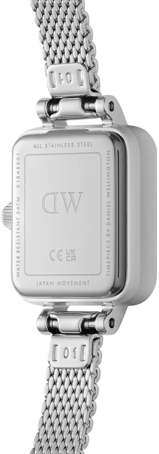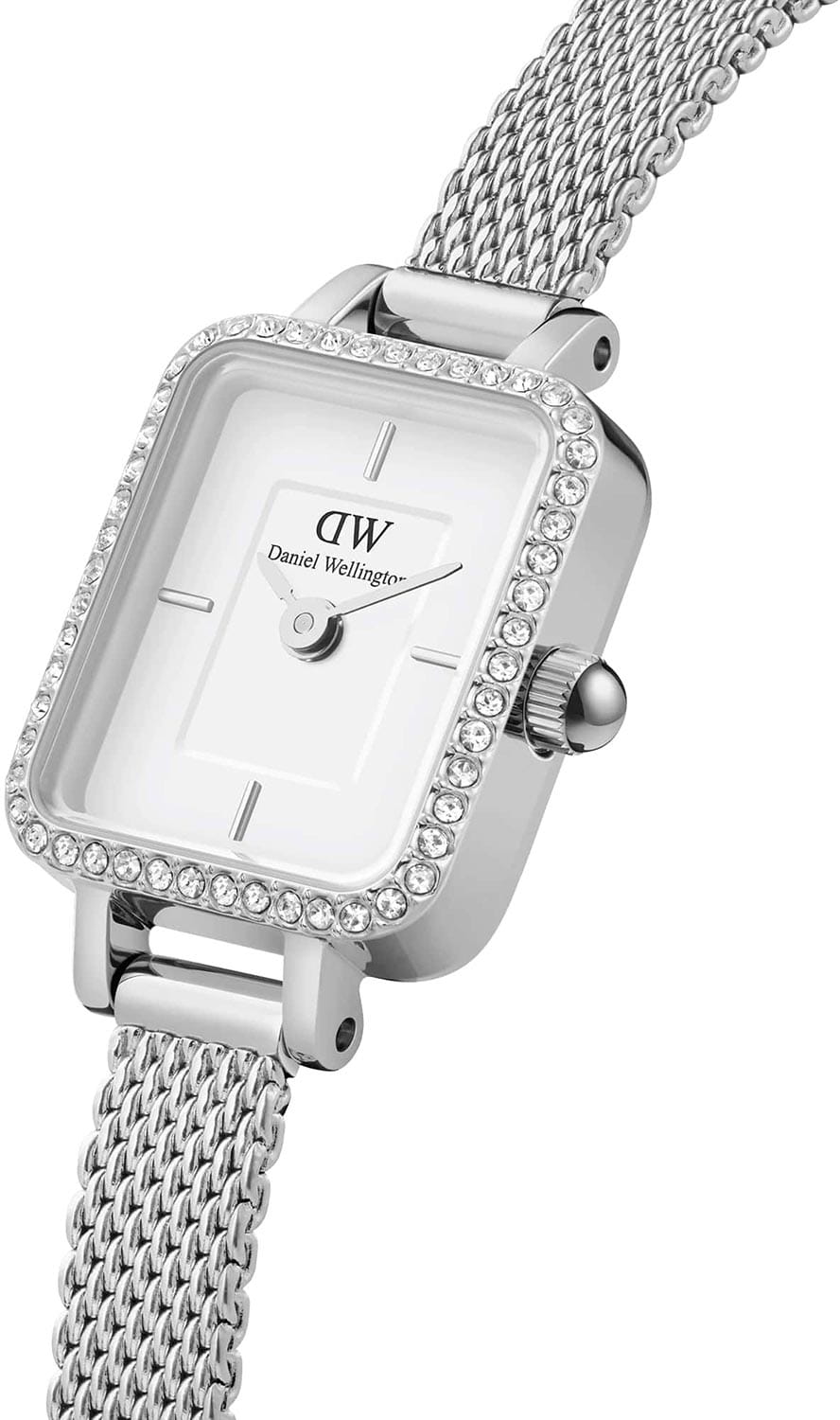 Женские наручные часы с минеральным стекломМинеральное стеклоМинеральное стекло представляет собой искусственно выращенный минерал кварца. Такое стекло отличается особой устойчивостью к повреждениям и царапинам. Уступает по некоторым качествам сапфировому стеклу. Daniel Wellington Quadro Mini Lumine Bezel Silver DW00100732, кварцевый механизм с высокой точностью. Корпус часов изготовлен из нержавеющей стали. Накладные метки в виде штрихов. Японский кварцевый механизм. Рифленая заводная головка. Класс водозащиты: 30 метров, позволит защитить корпус от случайных брызг или капель дождя. Стальной браслет миланского плетения на раскладном замкеРаскладной замокДанный вариант застежки используется только на часах с металлическим браслетом. Отличительная особенность такого крепления в том, что длина браслета становится универсальной и вы можете самостоятельно отрегулировать нужный вам размер – застежка просто двигается по браслету часов.. БезельБезельВнешний ободок, закрепляющий стекло. В спортивных часах так называется поворотное кольцо с делениями на циферблате, выполняет роль таймера – замеряет отрезки времени на шкале. Неподвижный безель – элемент декора. Однонаправленно вращающийся безель на дайверских часах позволяет фиксировать моменты погружения и выныривания на поверхность. инкрустирован кристаллами.