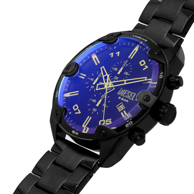 Мужские наручные часы-хронографХронографФункция позволяет измерять отрезки времени с особой точностью: часы, минуты, секунды. Верным признаком хронографа является наличие на циферблате 3 дополнительных окошек-счётчиков. с секундомеромСекундомерСекундоме́р — прибор, способный измерять интервалы времени с точностью до долей секунды. Diesel Spiked DZ4609, кварцевый механизм с высокой точностью. Класс водозащиты: 50 метров, позволит защитить корпус от случайных брызг или капель дождя. Корпус часов изготовлен из стали с IP-покрытиемIP-покрытиеМетод ионного напыления. Демонстрирует повышенную устойчивость к истиранию, окислению и химическим веществам. Под воздействием высокого давления и температуры около 1500°C молекулы металла надёжно соединяются с частицами корпуса часов.. Стальной браслет на раскладной застёжкеРаскладная застёжкаТакой тип застёжки используется только на браслетах из металла. Она никогда не раскрывается полностью, происходит разделение на 2 и более частей. Раскладывающая застёжка снизит вероятность потери часов к минимуму. с IP-покрытиемIP-покрытиеМетод ионного напыления. Демонстрирует повышенную устойчивость к истиранию, окислению и химическим веществам. Под воздействием высокого давления и температуры около 1500°C молекулы металла надёжно соединяются с частицами корпуса часов.. Окошко даты находится в положении 4 часа. Метки в виде штрихов и арабских цифр.