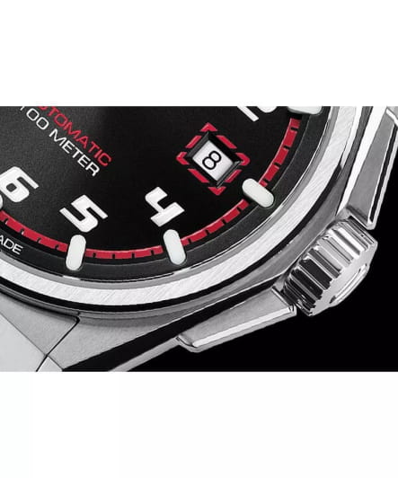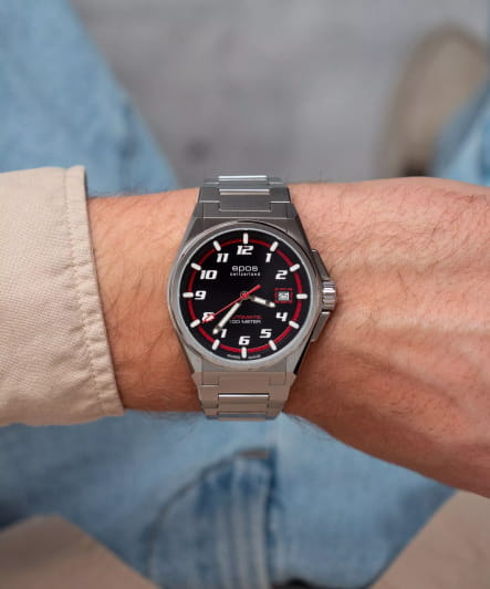 Мужские механические часы с автоподзаводом Epos из коллекции Sportive — это стильный и надёжный аксессуар с швейцарским качеством. Корпус диаметром 41 мм и толщиной 11 мм выполнен из нержавеющей стали 316L. Циферблат чёрного цвета с красными акцентами оформлен по технологии «солнечные лучи» (Sunray) и дополнен метками в виде штрихов и арабских цифр. Циферблат защищён сапфировым стекломСапфировое стеклоПрочный и надёжный материал из кристалла сапфира синтетического происхождения, характеризующийся особой твёрдостью и устойчивостью к царапинам и повреждениям.. Стрелки и объёмные метки с люминесцентным покрытиемЛюминесцентное покрытиеПозволяет считывать показания времени в темноте. Производители наносят на стрелки, часовые индексы, безель или поверхность циферблата светонакопительный состав, дающий холодное свечение., обеспечивающим отличную читаемость в темноте. Механизм — швейцарский калибр Sellita SW200 с запасом хода 38 часов. Окошко даты расположено в положении 3 часов. Завинчивающаяся коронка обеспечивает дополнительную защиту. Прозрачная задняя крышка позволяет наблюдать за работой механизма. Часы оснащены стальным браслетом на раскладной застёжкеРаскладная застёжкаТакой тип застёжки используется только на браслетах из металла. Она никогда не раскрывается полностью, происходит разделение на 2 и более частей. Раскладывающая застёжка снизит вероятность потери часов к минимуму.. Водонепроницаемость 100 м позволяет использовать часы для плавания и повседневного ношения. Гарантия — 24 месяца. Универсальный выбор для ценителя механики и спортивного стиля.