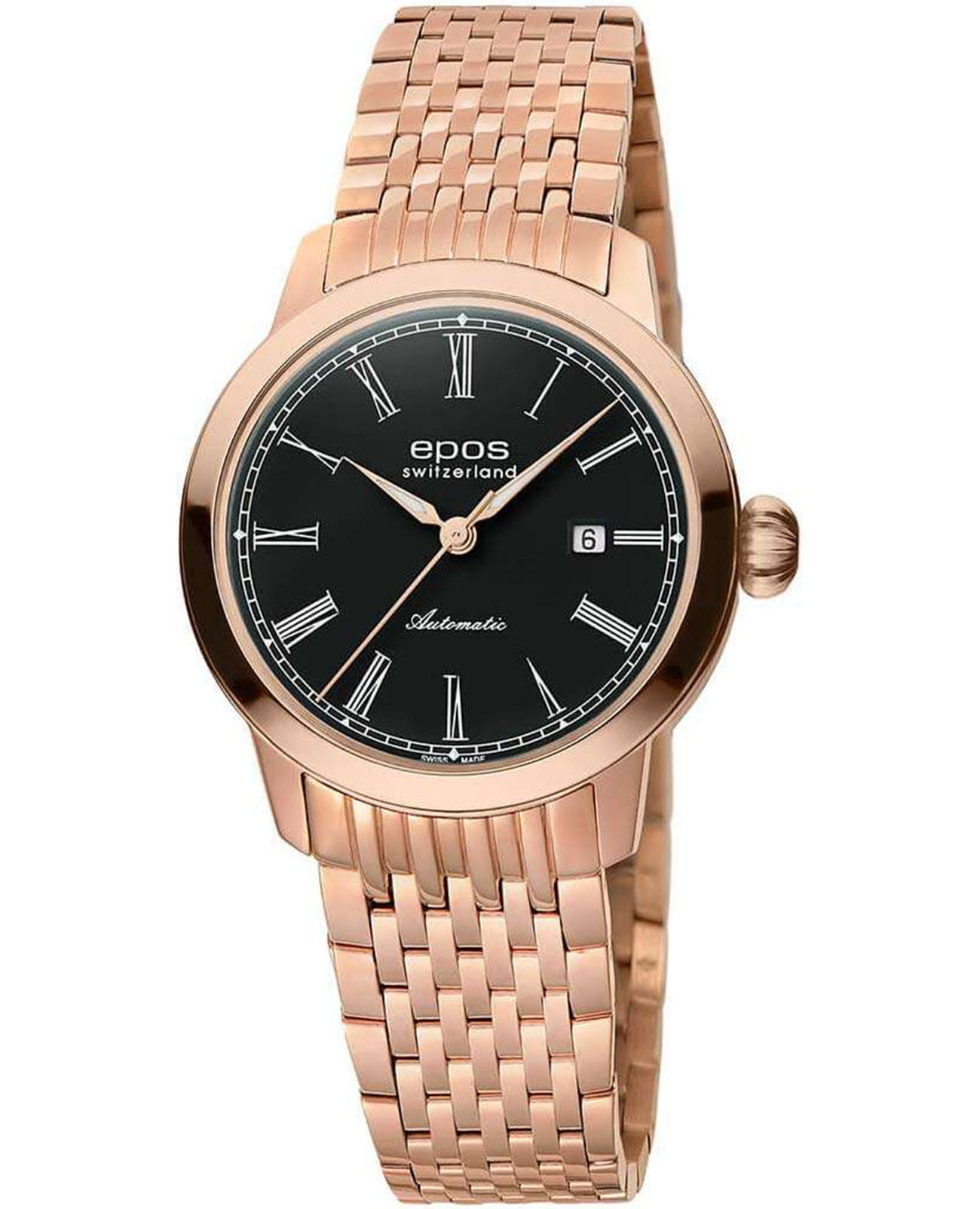 Женские механические часы с автоподзаводом Epos 4432.122.24.25.34 из коллекции Ladies - воплощение швейцарской утончённости и изысканной классики. Круглый корпус размером 29 мм из стали 316L с IP-покрытиемIP-покрытиеМетод ионного напыления. Демонстрирует повышенную устойчивость к истиранию, окислению и химическим веществам. Под воздействием высокого давления и температуры около 1500°C молекулы металла надёжно соединяются с частицами корпуса часов. цвета розового золота, чёрный циферблат с римскими цифрами и окошком даты на отметке 3 часов. Стекло сапфировоеСапфировое стеклоПрочный и надёжный материал из кристалла сапфира синтетического происхождения, характеризующийся особой твёрдостью и устойчивостью к царапинам и повреждениям. с антибликовым покрытием. Механизм - швейцарский ETA 2671 (25 камней, 28 800 пк/ч, запас хода 38 часов), декорированный и видимый через прозрачную заднюю крышку. Заводная головка завинчивающаяся. Водонепроницаемость 30 м. Браслет стальной 316L с IP-покрытиемIP-покрытиеМетод ионного напыления. Демонстрирует повышенную устойчивость к истиранию, окислению и химическим веществам. Под воздействием высокого давления и температуры около 1500°C молекулы металла надёжно соединяются с частицами корпуса часов. на раскладной застёжкеРаскладная застёжкаТакой тип застёжки используется только на браслетах из металла. Она никогда не раскрывается полностью, происходит разделение на 2 и более частей. Раскладывающая застёжка снизит вероятность потери часов к минимуму.. Идеальный выбор для тех, кто ценит швейцарское качество и элегантную женственность.