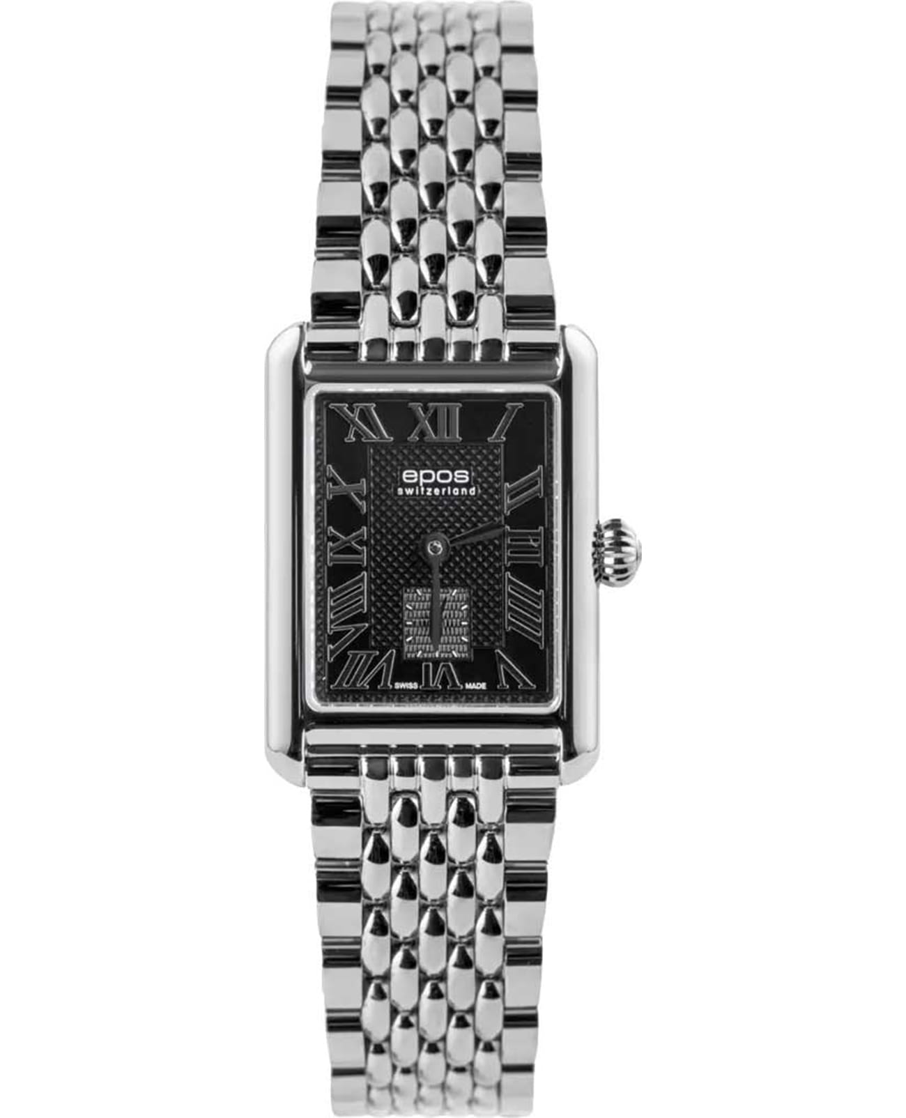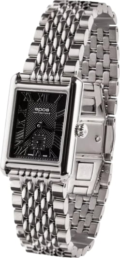 Женские кварцевые часы Epos - это элегантный аксессуар с прямоугольным корпусом размером 21×24 мм и толщиной 7 мм, выполненным из нержавеющей стали 316L. Циферблат чёрного цвета оформлен римскими цифрами и индексами. Секундная стрелка вынесена на отдельный субциферблат, что придаёт дизайну изысканности. Циферблат защищён сапфировым стекломСапфировое стеклоПрочный и надёжный материал из кристалла сапфира синтетического происхождения, характеризующийся особой твёрдостью и устойчивостью к царапинам и повреждениям., устойчивым к царапинам. Механизм — кварцевый калибр Ronda 1064. Часы оснащены стальным браслетом с застёжкой «бабочка» с кнопкамиЗастёжка "бабочка"Такой вид застёжки дополняется предохранителями, помогающими избежать случайного раскрытия браслета. Обладают изящным исполнением. . Водонепроницаемость 30 м позволяет использовать часы в повседневных условиях. Гарантия — 24 месяца. Идеальный выбор для тех, кто ценит швейцарское качество, классический стиль и точность.