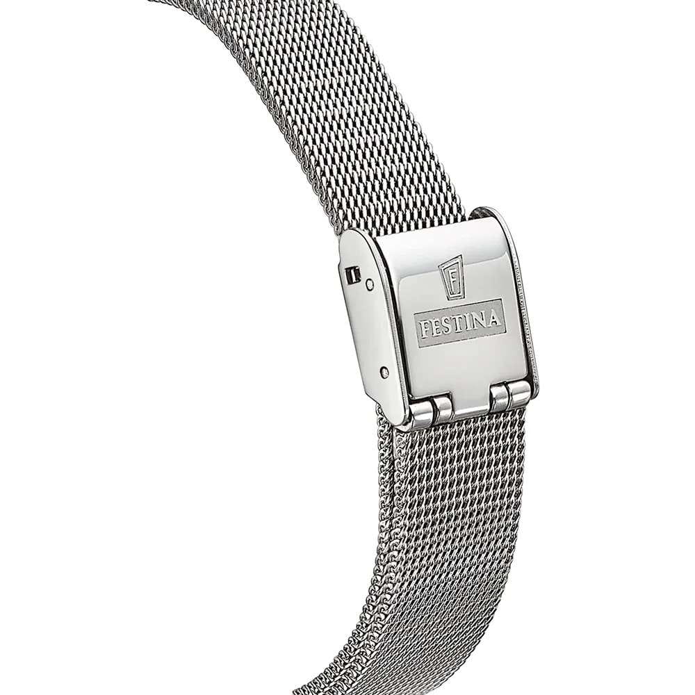 Часы Festina Mademoiselle F20712/1 для женщин представляют собой гармоничное сочетание современного стиля и функциональности. Эти часы имеют корпус из нержавеющей стали серебристого цвета шириной 33 мм, который придает изделию элегантный и утонченный вид. Серебристый циферблат защищен сапфировым стекломСапфировое стеклоПрочный и надёжный материал из кристалла сапфира синтетического происхождения, характеризующийся особой твёрдостью и устойчивостью к царапинам и повреждениям., что гарантирует устойчивость к царапинам и долговечность. Функция отображения даты, расположенная на отметке «6 часов», добавляет практичности и удобства в использовании.  Водонепроницаемость на глубине до 50 метров обеспечивает защиту от незначительных брызг, делая эти часы надежными в повседневном использовании. Браслет из нержавеющей стали в миланском плетении с раскладным замкомРаскладной замокДанный вариант застежки используется только на часах с металлическим браслетом. Отличительная особенность такого крепления в том, что длина браслета становится универсальной и вы можете самостоятельно отрегулировать нужный вам размер – застежка просто двигается по браслету часов. также выполнен в серебристом цвете и прекрасно дополняет общий дизайн, создавая цельный и привлекательный образ.