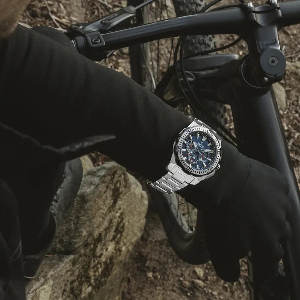 Мужские кварцевые часы Festina из коллекции Chrono-Bike — это выразительный спортивный аксессуар с функциональным дизайном. Корпус диаметром 45,5 мм и толщиной 14,4 мм выполнен из нержавеющей стали. Циферблат синего цвета оформлен метками в виде палочек и дополнен функцией хронографаХронографФункция позволяет измерять отрезки времени с особой точностью: часы, минуты, секунды. Верным признаком хронографа является наличие на циферблате 3 дополнительных окошек-счётчиков. и окошком даты. Стрелки и метки с люминесцентным покрытиемЛюминесцентное покрытиеПозволяет считывать показания времени в темноте. Производители наносят на стрелки, часовые индексы, безель или поверхность циферблата светонакопительный состав, дающий холодное свечение., обеспечивающим хорошую читаемость в темноте. Циферблат защищён минеральным стекломМинеральное стеклоМинеральное стекло представляет собой искусственно выращенный минерал кварца. Такое стекло отличается особой устойчивостью к повреждениям и царапинам. Уступает по некоторым качествам сапфировому стеклу.. Безель — стальной, неподвижный. Завинчивающаяся коронка и задняя крышка повышают надёжность конструкции. Часы оснащены стальным браслетом на раскладной застёжкеРаскладная застёжкаТакой тип застёжки используется только на браслетах из металла. Она никогда не раскрывается полностью, происходит разделение на 2 и более частей. Раскладывающая застёжка снизит вероятность потери часов к минимуму. с кнопками. Механизм — японский кварцевый калибр Miyota 0S20 с 60-месячным сроком службы батареи. Водонепроницаемость 200 м позволяет использовать часы для плавания и дайвинга. Вес — 206 г. Универсальный выбор для тех, кто ценит надёжность, функциональность и современный стиль.