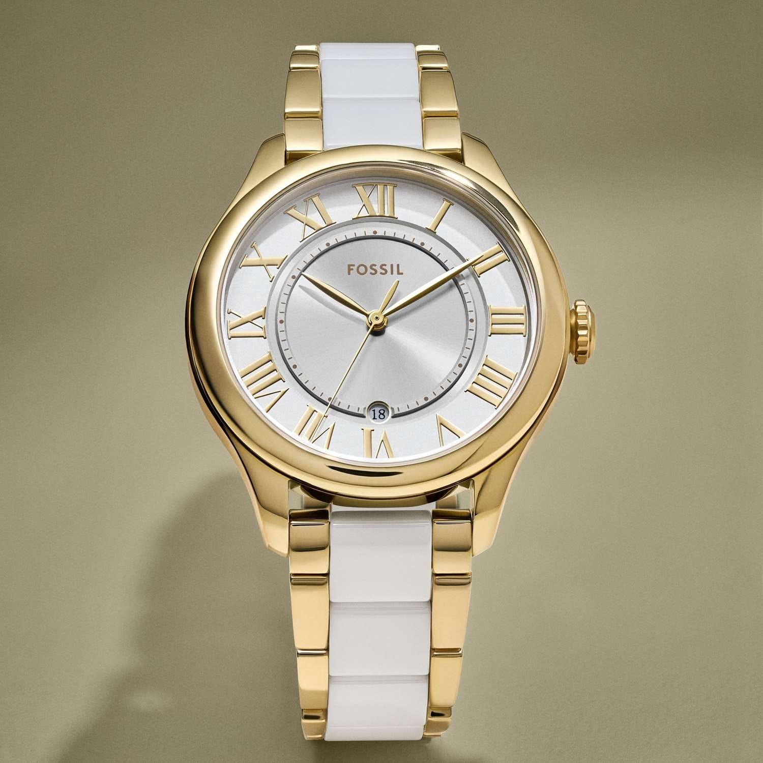 Женские кварцевые часы Fossil — это элегантный аксессуар, сочетающий стиль и надежность. Модель CE1131 выполнена в круглом корпусе диаметром 38 мм из нержавеющей стали с IP-покрытиемIP-покрытиеМетод ионного напыления. Демонстрирует повышенную устойчивость к истиранию, окислению и химическим веществам. Под воздействием высокого давления и температуры около 1500°C молекулы металла надёжно соединяются с частицами корпуса часов. цвета жёлтого золота. Циферблат белого цвета оформлен индексами и стрелками. Окошко даты расположено в положении 6 часов. Циферблат защищён минеральным стекломМинеральное стеклоМинеральное стекло представляет собой искусственно выращенный минерал кварца. Такое стекло отличается особой устойчивостью к повреждениям и царапинам. Уступает по некоторым качествам сапфировому стеклу.. Часы оснащены браслетом из керамики и стали с IP-покрытиемIP-покрытиеМетод ионного напыления. Демонстрирует повышенную устойчивость к истиранию, окислению и химическим веществам. Под воздействием высокого давления и температуры около 1500°C молекулы металла надёжно соединяются с частицами корпуса часов. на застёжке «бабочка» с кнопкамиЗастёжка "бабочка"Такой вид застёжки дополняется предохранителями, помогающими избежать случайного раскрытия браслета. Обладают изящным исполнением. . Водонепроницаемость 50 м позволяет использовать часы для плавания и повседневного ношения. Идеальный выбор для тех, кто ценит американское качество и безупречный дизайн.
