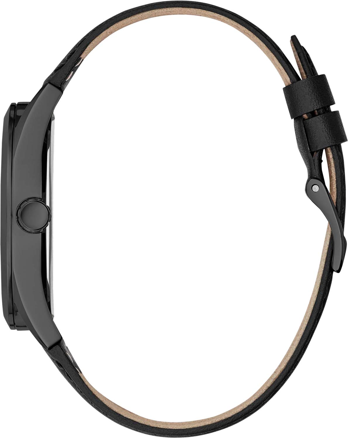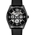 Мужские кварцевые часы-скелетоны с минеральным стекломМинеральное стеклоМинеральное стекло представляет собой искусственно выращенный минерал кварца. Такое стекло отличается особой устойчивостью к повреждениям и царапинам. Уступает по некоторым качествам сапфировому стеклу. Guess Dress Steel GW0389G4, кварцевый механизм с высокой точностью. Класс водозащиты: 50 метров, позволит защитить корпус от случайных брызг или капель дождя. Корпус часов изготовлен из стали с PVD-покрытиемPVDУльтратонкое покрытие наносится в технике вакуумного напыления, сочетает в себе нитрид титана особой прочности со слоем золота или оксида хрома. Несёт в себе декоративную или защитную функцию.. Кожаный ремешок на стандартной застёжке. Стрелки и метки с люминесцентным покрытиемЛюминесцентное покрытиеПозволяет считывать показания времени в темноте. Производители наносят на стрелки, часовые индексы, безель или поверхность циферблата светонакопительный состав, дающий холодное свечение.. 12-ти и 24-х часовой формат  времени. Циферблат выполнен по технологии Sunray (солнечные лучи). 24-х часовой формат времени, число и день недели отображаются на отдельных циферблатах. Рифленая заводная головка.