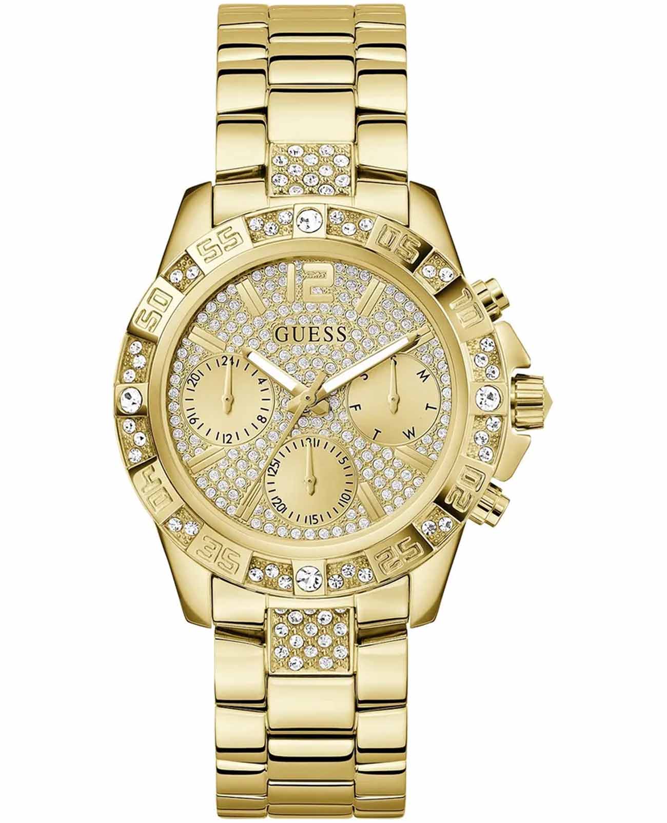 Женские наручные часы Guess Dress GW0771L2 с минеральным стекломМинеральное стеклоМинеральное стекло представляет собой искусственно выращенный минерал кварца. Такое стекло отличается особой устойчивостью к повреждениям и царапинам. Уступает по некоторым качествам сапфировому стеклу., кварцевый механизм с высокой точностью. Корпус часов изготовлен из стали с IP-покрытиемIP-покрытиеМетод ионного напыления. Демонстрирует повышенную устойчивость к истиранию, окислению и химическим веществам. Под воздействием высокого давления и температуры около 1500°C молекулы металла надёжно соединяются с частицами корпуса часов.. БезельБезельВнешний ободок, закрепляющий стекло. В спортивных часах так называется поворотное кольцо с делениями на циферблате, выполняет роль таймера – замеряет отрезки времени на шкале. Неподвижный безель – элемент декора. Однонаправленно вращающийся безель на дайверских часах позволяет фиксировать моменты погружения и выныривания на поверхность. с IP-покрытиемIP-покрытиеМетод ионного напыления. Демонстрирует повышенную устойчивость к истиранию, окислению и химическим веществам. Под воздействием высокого давления и температуры около 1500°C молекулы металла надёжно соединяются с частицами корпуса часов. украшен кристаллами. Стрелки с люминесцентным покрытиемЛюминесцентное покрытиеПозволяет считывать показания времени в темноте. Производители наносят на стрелки, часовые индексы, безель или поверхность циферблата светонакопительный состав, дающий холодное свечение.. Класс водозащиты: 50 метров, позволит защитить корпус от случайных брызг или капель дождя. Стальной браслет с IP-покрытиемIP-покрытиеМетод ионного напыления. Демонстрирует повышенную устойчивость к истиранию, окислению и химическим веществам. Под воздействием высокого давления и температуры около 1500°C молекулы металла надёжно соединяются с частицами корпуса часов. на раскладной застёжкеРаскладная застёжкаТакой тип застёжки используется только на браслетах из металла. Она никогда не раскрывается полностью, происходит разделение на 2 и более частей. Раскладывающая застёжка снизит вероятность потери часов к минимуму..