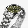 Hamilton Khaki Field Auto H70455160 — надёжные полевые часы с военным характером и швейцарской точностью, созданные для активного образа жизни. Корпус диаметром 38 мм выполнен из нержавеющей стали с сатинированной отделкой. Прозрачная задняя крышка позволяет наблюдать за работой механизма. Циферблат защищён выпуклым сапфировым стекломСапфировое стеклоПрочный и надёжный материал из кристалла сапфира синтетического происхождения, характеризующийся особой твёрдостью и устойчивостью к царапинам и повреждениям. с антибликовым покрытиемАнтибликовое покрытиеСлой оксида металла в 0,13-0,3 микрон, благодаря которому стекло часов не бликует и не отражает свет. Антибликовое покрытие уменьшает отражение света в 10 раз, обеспечивая отличную читаемость показателей циферблата.. Зелёный циферблат оформлен в классическом военном стиле: крупные арабские цифры, 24-часовая шкала по внутреннему кольцу и дата на позиции «3 часа». Стрелки и метки покрыты люминесцентным покрытиемЛюминесцентное покрытиеПозволяет считывать показания времени в темноте. Производители наносят на стрелки, часовые индексы, безель или поверхность циферблата светонакопительный состав, дающий холодное свечение., обеспечивая читаемость в любых условиях. Внутри установлен автоматический механизм H-10 с увеличенным запасом хода до 80 часов. Модель комплектуется браслетом из нержавеющей стали с раскладной застёжкойРаскладная застёжкаТакой тип застёжки используется только на браслетах из металла. Она никогда не раскрывается полностью, происходит разделение на 2 и более частей. Раскладывающая застёжка снизит вероятность потери часов к минимуму., обеспечивающей удобную и надёжную посадку. Водонепроницаемость 100 метров делает эту модель отличным выбором как для города, так и для активного отдыха. Hamilton Khaki Field Auto — идеальный баланс практичности, стиля и швейцарского качества.