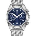 Мужские стильные швейцарские часы Hamilton Khaki Aviation Pilot Pioneer Mechanical Chronograph 40mm H76409140. Стальной корпус диаметром 40 мм и увеличенной толщиной 14,35 мм подчеркивает брутальность модели, а сапфировое стеклоСапфировое стеклоПрочный и надёжный материал из кристалла сапфира синтетического происхождения, характеризующийся особой твёрдостью и устойчивостью к царапинам и повреждениям. с антибликовым покрытиемАнтибликовое покрытиеСлой оксида металла в 0,13-0,3 микрон, благодаря которому стекло часов не бликует и не отражает свет. Антибликовое покрытие уменьшает отражение света в 10 раз, обеспечивая отличную читаемость показателей циферблата. обеспечивает превосходную читаемость матового синего циферблата со стрелками с люминесцентным покрытиемЛюминесцентное покрытиеПозволяет считывать показания времени в темноте. Производители наносят на стрелки, часовые индексы, безель или поверхность циферблата светонакопительный состав, дающий холодное свечение. Super-LumiNova®. Модель оснащена функцией хронографаХронографФункция позволяет измерять отрезки времени с особой точностью: часы, минуты, секунды. Верным признаком хронографа является наличие на циферблате 3 дополнительных окошек-счётчиков.. Механизм с ручным заводом H-51 оснащен кремниевой спиралью, обеспечивающей запас хода 60 часов и устойчивость к магнитным полям. Модель укомплектована браслетом миланского плетения из нержавеющей стали с раскладным замкомРаскладной замокДанный вариант застежки используется только на часах с металлическим браслетом. Отличительная особенность такого крепления в том, что длина браслета становится универсальной и вы можете самостоятельно отрегулировать нужный вам размер – застежка просто двигается по браслету часов., обеспечивающий надёжную посадку. Водонепроницаемость часов достигает 10 атмосфер (100 метров), делающая их подходящими для повседневного использования и активного отдыха. Это сочетание высокой прочности, точности и изысканного дизайна для уверенных в себе мужчин.