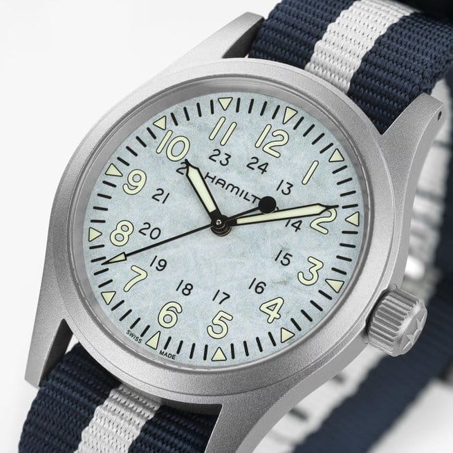 Мужские швейцарские часы Hamilton Khaki Field Mechanical Exclusive Edition H89459940 - механический механизм (автоматический калибр) с высокой точностью. Циферблат дополнен сине-белым полосатым ремешком, который символизирует цвета снега в тени и на солнце. Завершает образ этой эксклюзивной серии задняя крышка корпуса, украшенная искусной гравировкой силуэта Маттерхорна. Сапфировое стеклоСапфировое стеклоПрочный и надёжный материал из кристалла сапфира синтетического происхождения, характеризующийся особой твёрдостью и устойчивостью к царапинам и повреждениям. устойчивое к появлению царапин, обладающее высокой прозрачностью. Класс водозащиты: 50 метров позволит защитить корпус от случайных брызг или капель дождя. Корпус часов изготовлен из нержавеющей стали, диаметром 38 мм и толщиной 9.5 мм. Текстильный ремешок NATOРемешок NATOРемешок NATO — это прочный, универсальный и сменный часовой ремешок, изначально созданный для военных. Он изготовлен из нейлона или другого прочного материала и имеет уникальную конструкцию, которая позволяет часам оставаться на запястье даже в случае поломки одной из прикрепляющих точек. на стандартной застежке обеспечивает комфортное ношение на запястье. Стрелки и метки с люминесцентным покрытиемЛюминесцентное покрытиеПозволяет считывать показания времени в темноте. Производители наносят на стрелки, часовые индексы, безель или поверхность циферблата светонакопительный состав, дающий холодное свечение. Super-LumiNova® обеспечивает отличную видимость в темноте. Часы Khaki Field Mechanical – это точная копия своего оригинального предшественника 1960-х годов и верны военному наследию Hamilton, обладая механическим калибром и запасом хода до 80 часов. Откройте для себя нашу коллекцию Khaki Field.