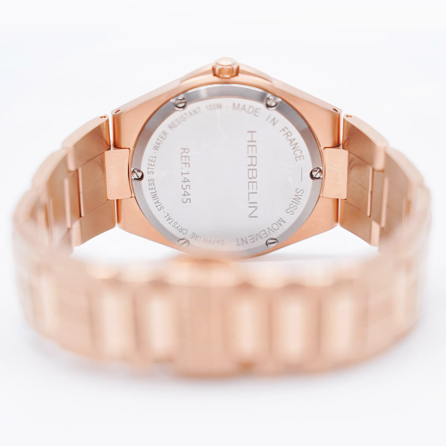 Женские кварцевые часы Herbelin Cap Camarat 14545BPR19 – отражающий идеальное сочетание современного дизайна, надёжности и функциональности. Элегантный облик станет превосходным завершением образа, наделив его индивидуальным характером. Корпус из нержавеющей стали с PVD-покрытиемPVDУльтратонкое покрытие наносится в технике вакуумного напыления, сочетает в себе нитрид титана особой прочности со слоем золота или оксида хрома. Несёт в себе декоративную или защитную функцию. цвета розового золота, диаметром 33 мм и толщиной 7.1 мм, идеально сбалансирован и элегантен. Сапфировое стеклоСапфировое стеклоПрочный и надёжный материал из кристалла сапфира синтетического происхождения, характеризующийся особой твёрдостью и устойчивостью к царапинам и повреждениям. защищает циферблат от царапин и устойчивое к механическим повреждениям. БезельБезельВнешний ободок, закрепляющий стекло. В спортивных часах так называется поворотное кольцо с делениями на циферблате, выполняет роль таймера – замеряет отрезки времени на шкале. Неподвижный безель – элемент декора. Однонаправленно вращающийся безель на дайверских часах позволяет фиксировать моменты погружения и выныривания на поверхность. украшен винтами, заводная головка с защитой. Окошко даты находится в положении 6 часов. Стрелки и метки с люминесцентным покрытиемЛюминесцентное покрытиеПозволяет считывать показания времени в темноте. Производители наносят на стрелки, часовые индексы, безель или поверхность циферблата светонакопительный состав, дающий холодное свечение.. Стальной браслет с PVD-покрытиемPVDУльтратонкое покрытие наносится в технике вакуумного напыления, сочетает в себе нитрид титана особой прочности со слоем золота или оксида хрома. Несёт в себе декоративную или защитную функцию. на застёжке-бабочке с кнопкамиЗастёжка "бабочка"Такой вид застёжки дополняется предохранителями, помогающими избежать случайного раскрытия браслета. Обладают изящным исполнением. обеспечивает комфортное ношение. Водозащита 100 метров позволит плавать, нырять и заниматься другими водными видами спорта. Эта модель – отличный выбор для тех, кто ищет сочетание стиля, качества и функциональности. Часы станут не только полезным аксессуаром, но и выразительным элементом вашего имиджа.