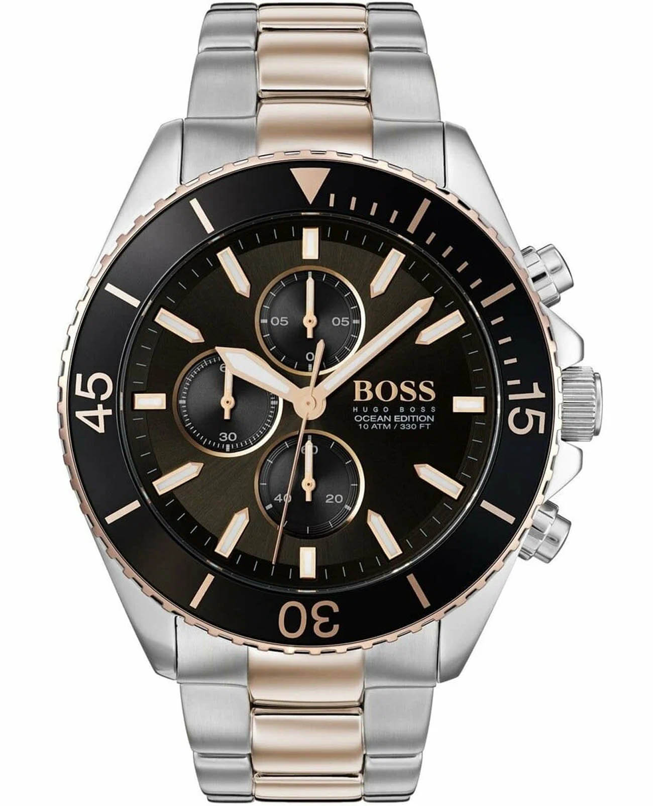 Мужские часы Hugo Boss Ocean HB1513705 представлены в изысканном 48-мм корпусе из нержавеющей стали с поворотным безелемБезельВнешний ободок, закрепляющий стекло. В спортивных часах так называется поворотное кольцо с делениями на циферблате, выполняет роль таймера – замеряет отрезки времени на шкале. Неподвижный безель – элемент декора. Однонаправленно вращающийся безель на дайверских часах позволяет фиксировать моменты погружения и выныривания на поверхность. с IP-покрытиемIP-покрытиеМетод ионного напыления. Демонстрирует повышенную устойчивость к истиранию, окислению и химическим веществам. Под воздействием высокого давления и температуры около 1500°C молекулы металла надёжно соединяются с частицами корпуса часов.. Элегантная модель оснащена кварцевым механизмом с функциями хронографаХронографФункция позволяет измерять отрезки времени с особой точностью: часы, минуты, секунды. Верным признаком хронографа является наличие на циферблате 3 дополнительных окошек-счётчиков. и секундомераСекундомерСекундоме́р — прибор, способный измерять интервалы времени с точностью до долей секунды.. Черный циферблат защищен устойчивым к царапинам минеральным стекломМинеральное стеклоМинеральное стекло представляет собой искусственно выращенный минерал кварца. Такое стекло отличается особой устойчивостью к повреждениям и царапинам. Уступает по некоторым качествам сапфировому стеклу.. Браслет из стали с IP-покрытиемIP-покрытиеМетод ионного напыления. Демонстрирует повышенную устойчивость к истиранию, окислению и химическим веществам. Под воздействием высокого давления и температуры около 1500°C молекулы металла надёжно соединяются с частицами корпуса часов. дополнен раскладной застёжкойРаскладная застёжкаТакой тип застёжки используется только на браслетах из металла. Она никогда не раскрывается полностью, происходит разделение на 2 и более частей. Раскладывающая застёжка снизит вероятность потери часов к минимуму., а стрелки и метки покрыты люминесцентным составомЛюминесцентное покрытиеПозволяет считывать показания времени в темноте. Производители наносят на стрелки, часовые индексы, безель или поверхность циферблата светонакопительный состав, дающий холодное свечение. для видимости в темноте. Водонепроницаемость 100 метров (10 ATM) позволяет использовать часы для плавания других водных видов спорта. Точность хода составляет ±15 секунд в месяц, что соответствует стандартам кварцевых механизмов. Дизайн модели сочетает спортивную функциональность с элегантным стилем.
