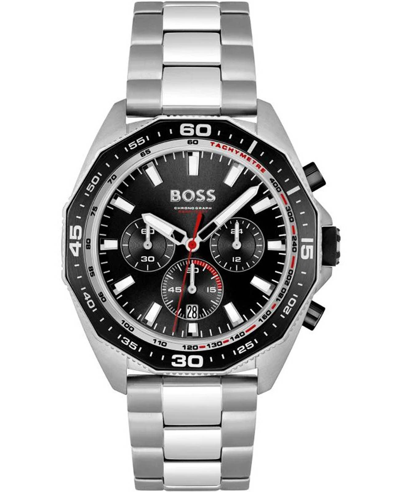 Мужские часы Hugo Boss Energy HB1513971 представлены в круглом 44-мм корпусе из нержавеющей стали с частичным IP-покрытиемIP-покрытиеМетод ионного напыления. Демонстрирует повышенную устойчивость к истиранию, окислению и химическим веществам. Под воздействием высокого давления и температуры около 1500°C молекулы металла надёжно соединяются с частицами корпуса часов.. Оснащены кварцевым механизмом с функциями хронографаХронографФункция позволяет измерять отрезки времени с особой точностью: часы, минуты, секунды. Верным признаком хронографа является наличие на циферблате 3 дополнительных окошек-счётчиков., секундомеромСекундомерСекундоме́р — прибор, способный измерять интервалы времени с точностью до долей секунды. и тахиметромТахиметрРазмеченная шкала, располагается на ободке или безеле часов. Тахиметр позволяет рассчитать скорость на определённом участке пути, расстояние измеряется в километрах или милях. на безелеБезельВнешний ободок, закрепляющий стекло. В спортивных часах так называется поворотное кольцо с делениями на циферблате, выполняет роль таймера – замеряет отрезки времени на шкале. Неподвижный безель – элемент декора. Однонаправленно вращающийся безель на дайверских часах позволяет фиксировать моменты погружения и выныривания на поверхность.. Черный циферблат защищен устойчивым к царапинам минеральным стекломМинеральное стеклоМинеральное стекло представляет собой искусственно выращенный минерал кварца. Такое стекло отличается особой устойчивостью к повреждениям и царапинам. Уступает по некоторым качествам сапфировому стеклу.. Браслет из нержавеющей стали дополнен раскладной застёжкойРаскладная застёжкаТакой тип застёжки используется только на браслетах из металла. Она никогда не раскрывается полностью, происходит разделение на 2 и более частей. Раскладывающая застёжка снизит вероятность потери часов к минимуму., а стрелки покрыты люминесцентным составомЛюминесцентное покрытиеПозволяет считывать показания времени в темноте. Производители наносят на стрелки, часовые индексы, безель или поверхность циферблата светонакопительный состав, дающий холодное свечение. для видимости в темноте. Водонепроницаемость 50 метров (5 ATM) позволяет использовать часы для плавания.
