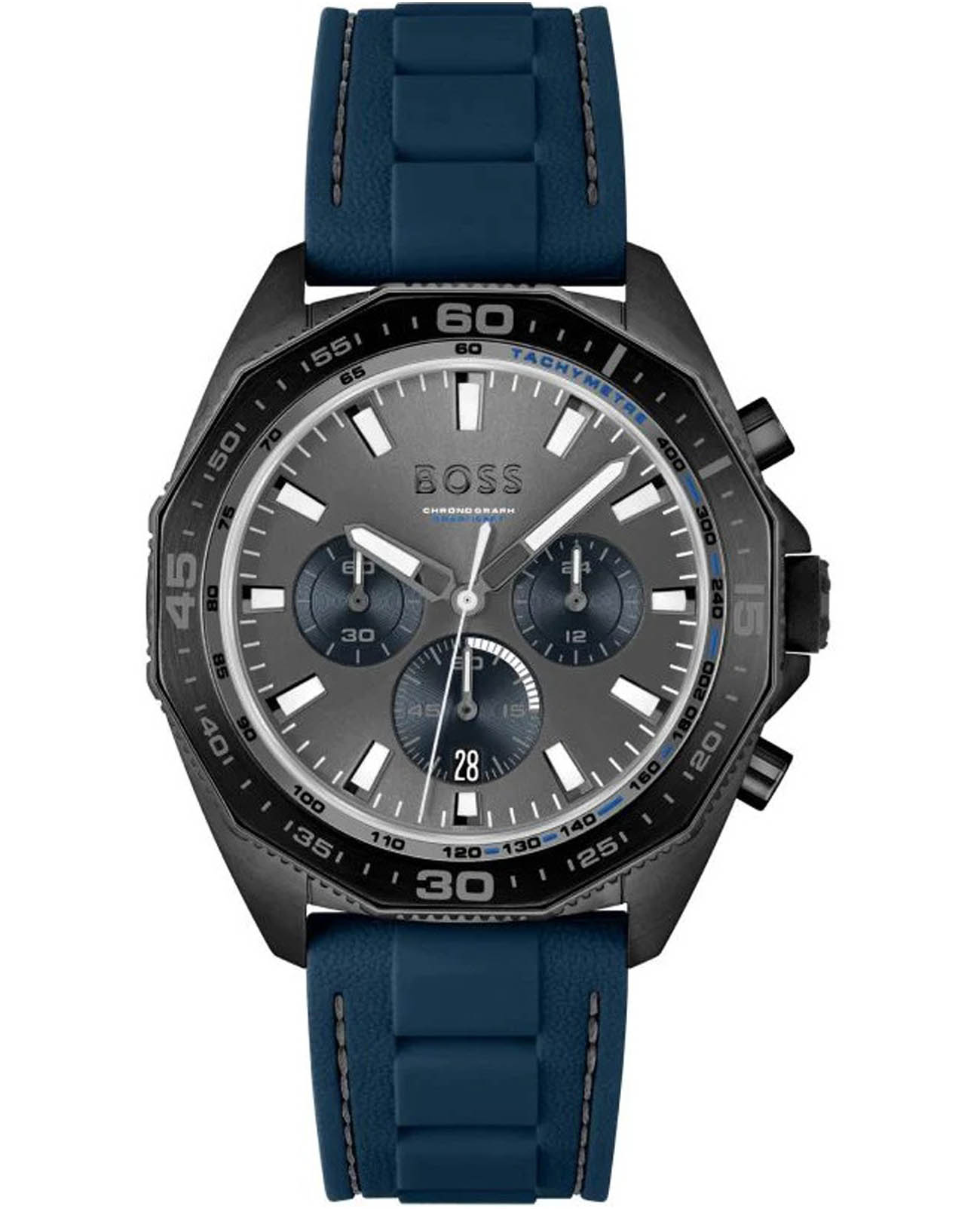Мужские часы Hugo Boss Energy HB1513972 представлены в круглом 44-мм корпусе из нержавеющей стали с IP-покрытиемIP-покрытиеМетод ионного напыления. Демонстрирует повышенную устойчивость к истиранию, окислению и химическим веществам. Под воздействием высокого давления и температуры около 1500°C молекулы металла надёжно соединяются с частицами корпуса часов.. Оснащены кварцевым механизмом с функциями хронографаХронографФункция позволяет измерять отрезки времени с особой точностью: часы, минуты, секунды. Верным признаком хронографа является наличие на циферблате 3 дополнительных окошек-счётчиков., секундомеромСекундомерСекундоме́р — прибор, способный измерять интервалы времени с точностью до долей секунды. и тахиметромТахиметрРазмеченная шкала, располагается на ободке или безеле часов. Тахиметр позволяет рассчитать скорость на определённом участке пути, расстояние измеряется в километрах или милях. на безелеБезельВнешний ободок, закрепляющий стекло. В спортивных часах так называется поворотное кольцо с делениями на циферблате, выполняет роль таймера – замеряет отрезки времени на шкале. Неподвижный безель – элемент декора. Однонаправленно вращающийся безель на дайверских часах позволяет фиксировать моменты погружения и выныривания на поверхность.. Серый циферблат защищен устойчивым к царапинам минеральным стекломМинеральное стеклоМинеральное стекло представляет собой искусственно выращенный минерал кварца. Такое стекло отличается особой устойчивостью к повреждениям и царапинам. Уступает по некоторым качествам сапфировому стеклу.. Каучуковый ремешок дополнен стандартной застежкой, а стрелки покрыты люминесцентным составомЛюминесцентное покрытиеПозволяет считывать показания времени в темноте. Производители наносят на стрелки, часовые индексы, безель или поверхность циферблата светонакопительный состав, дающий холодное свечение. для видимости в темноте. Водонепроницаемость 50 метров (5 ATM) позволяет использовать часы для плавания.