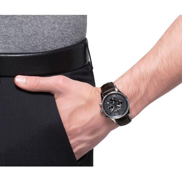 Мужские наручные часы с хронографом; Корпус - Нержавеющая сталь, Стекло - Минеральное, Водозащита -100 м. (WR 100), Материал ремешка - Кожаный