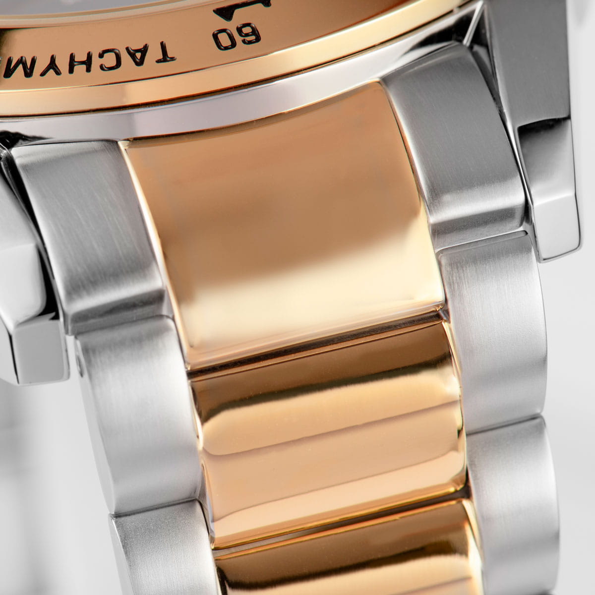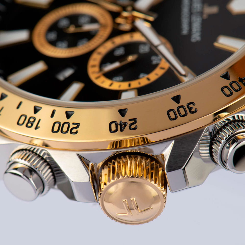 Кварцевый хронографХронографФункция позволяет измерять отрезки времени с особой точностью: часы, минуты, секунды. Верным признаком хронографа является наличие на циферблате 3 дополнительных окошек-счётчиков. в мощном корпусе диаметром 48 мм. Нержавеющая сталь с PVD-покрытиемPVDУльтратонкое покрытие наносится в технике вакуумного напыления, сочетает в себе нитрид титана особой прочности со слоем золота или оксида хрома. Несёт в себе декоративную или защитную функцию., из которой он сделан, отличается гипоаллергенными свойствами и стойкостью к коррозии. Широкий контрастный безельБезельВнешний ободок, закрепляющий стекло. В спортивных часах так называется поворотное кольцо с делениями на циферблате, выполняет роль таймера – замеряет отрезки времени на шкале. Неподвижный безель – элемент декора. Однонаправленно вращающийся безель на дайверских часах позволяет фиксировать моменты погружения и выныривания на поверхность. с тахиметрической шкалой обрамляет зеленый циферблат. На нем расположены три дополнительных индикатора и окошко даты. С помощью индикаторов можно засекать временные промежутки (секунды и минуты) и определять время в 24-часовом формате времяисчисления. В модели установлено минеральное стеклоМинеральное стеклоМинеральное стекло представляет собой искусственно выращенный минерал кварца. Такое стекло отличается особой устойчивостью к повреждениям и царапинам. Уступает по некоторым качествам сапфировому стеклу.. Повышенная водостойкость равна 10 атмосфер. Браслет из нержавеющей стали с частичным PVD-покрытиемPVDУльтратонкое покрытие наносится в технике вакуумного напыления, сочетает в себе нитрид титана особой прочности со слоем золота или оксида хрома. Несёт в себе декоративную или защитную функцию. удерживает на запястье раскладная застёжкаРаскладная застёжкаТакой тип застёжки используется только на браслетах из металла. Она никогда не раскрывается полностью, происходит разделение на 2 и более частей. Раскладывающая застёжка снизит вероятность потери часов к минимуму.. Часы Jacques Lemans, надежные и функциональные, хорошо дополнят образ в спортивном или повседневном стиле.