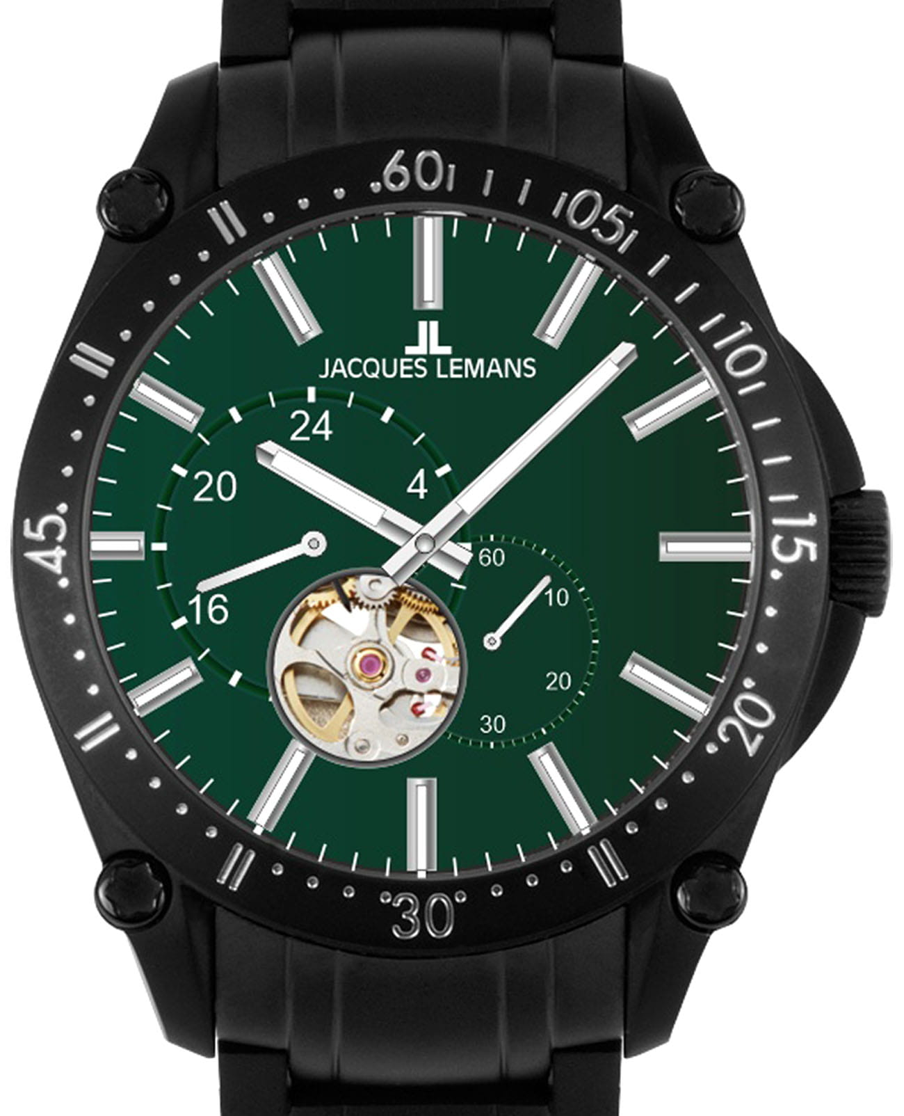 Мужские механические часы-скелетоны Jacques Lemans 1-2201H – лаконичная красота и изысканная элегантность. Оригинальная модель с классическим оформлением станет превосходным завершением образа, наделив его индивидуальным характером. Корпус выполнен из нержавеющей стали с PVD-покрытиемPVDУльтратонкое покрытие наносится в технике вакуумного напыления, сочетает в себе нитрид титана особой прочности со слоем золота или оксида хрома. Несёт в себе декоративную или защитную функцию. черного цвета, диаметром 44 мм, что обеспечивает долговечность и утончённый внешний вид. Минеральное стеклоМинеральное стеклоМинеральное стекло представляет собой искусственно выращенный минерал кварца. Такое стекло отличается особой устойчивостью к повреждениям и царапинам. Уступает по некоторым качествам сапфировому стеклу. с сапфировым напылением защищает циферблат от царапин. Стальной браслет с PVD-покрытиемPVDУльтратонкое покрытие наносится в технике вакуумного напыления, сочетает в себе нитрид титана особой прочности со слоем золота или оксида хрома. Несёт в себе декоративную или защитную функцию. на раскладной застёжкеРаскладная застёжкаТакой тип застёжки используется только на браслетах из металла. Она никогда не раскрывается полностью, происходит разделение на 2 и более частей. Раскладывающая застёжка снизит вероятность потери часов к минимуму. обеспечивает комфортное ношение. Водозащита 100 метров позволит плавать, нырять и заниматься другими водными видами спорта. Стрелки и метки с люминесцентным покрытиемЛюминесцентное покрытиеПозволяет считывать показания времени в темноте. Производители наносят на стрелки, часовые индексы, безель или поверхность циферблата светонакопительный состав, дающий холодное свечение. позволяющие легко определять время даже в темноте. БезельБезельВнешний ободок, закрепляющий стекло. В спортивных часах так называется поворотное кольцо с делениями на циферблате, выполняет роль таймера – замеряет отрезки времени на шкале. Неподвижный безель – элемент декора. Однонаправленно вращающийся безель на дайверских часах позволяет фиксировать моменты погружения и выныривания на поверхность. дополнен минутной шкалой. Запас хода 42 ч. На отдельные циферблаты вынесены индикатор 24-х часов и малая секундная стрелка. Сквозь прозрачное окошко можно наблюдать за работой механизма часов. Рифленая заводная головка с защитой. Это аксессуар для мужчины, который ценит классический стиль и функциональность.