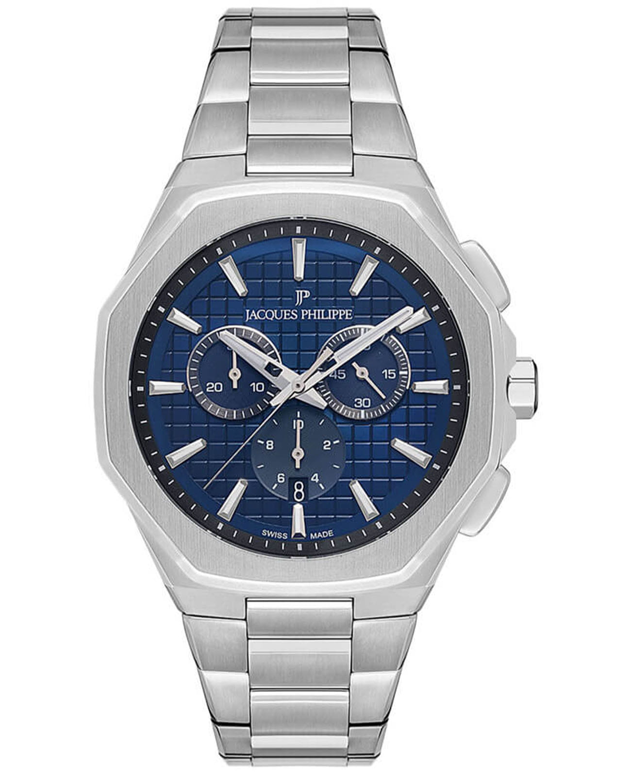 Швейцарские мужские часы-хронографХронографФункция позволяет измерять отрезки времени с особой точностью: часы, минуты, секунды. Верным признаком хронографа является наличие на циферблате 3 дополнительных окошек-счётчиков. с секундомеромСекундомерСекундоме́р — прибор, способный измерять интервалы времени с точностью до долей секунды. Jacques Philippe Octagon JPQGC391336, кварцевый механизм с высокой точностью. Сапфировое стеклоСапфировое стеклоПрочный и надёжный материал из кристалла сапфира синтетического происхождения, характеризующийся особой твёрдостью и устойчивостью к царапинам и повреждениям. устойчивое к появлению царапин, обладающее высокой прозрачностью. Корпус часов изготовлен из нержавеющей стали. На циферблате три дополнительных индикатора. Стрелки и метки с люминесцентным покрытиемЛюминесцентное покрытиеПозволяет считывать показания времени в темноте. Производители наносят на стрелки, часовые индексы, безель или поверхность циферблата светонакопительный состав, дающий холодное свечение.. Окошко даты находится в положении 6 часов. Класс водозащиты: 50 метров, позволит защитить корпус от случайных брызг или капель дождя. Стальной браслет на застёжке «бабочка» с кнопкамиЗастёжка "бабочка"Такой вид застёжки дополняется предохранителями, помогающими избежать случайного раскрытия браслета. Обладают изящным исполнением. .