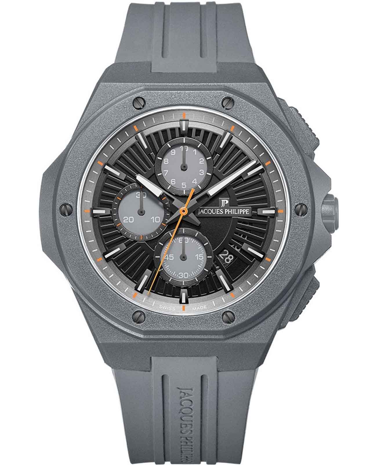Часы Jacques Philippe JPQGC518447 из коллекции Militia — стильные швейцарские часы с функцией хронографаХронографФункция позволяет измерять отрезки времени с особой точностью: часы, минуты, секунды. Верным признаком хронографа является наличие на циферблате 3 дополнительных окошек-счётчиков. и секундомераСекундомерСекундоме́р — прибор, способный измерять интервалы времени с точностью до долей секунды., которые сочетают в себе элегантность и современный функционал. Модель оснащена надежным кварцевым механизмом, обеспечивающим высокую точность хода. Корпус выполнен из нержавеющей стали 316L с износостойким серым IP-покрытиемIP-покрытиеМетод ионного напыления. Демонстрирует повышенную устойчивость к истиранию, окислению и химическим веществам. Под воздействием высокого давления и температуры около 1500°C молекулы металла надёжно соединяются с частицами корпуса часов., диаметр корпуса составляет 48 мм, толщина — 12,5 мм. Сапфировое стеклоСапфировое стеклоПрочный и надёжный материал из кристалла сапфира синтетического происхождения, характеризующийся особой твёрдостью и устойчивостью к царапинам и повреждениям. защищает часы от царапин и сохраняет прозрачность даже при активном использовании. Черный циферблат дополнен тремя дополнительными индикаторами и окошком даты в положении 4 часа, а стрелки имеют люминесцентное покрытиеЛюминесцентное покрытиеПозволяет считывать показания времени в темноте. Производители наносят на стрелки, часовые индексы, безель или поверхность циферблата светонакопительный состав, дающий холодное свечение.  для удобства чтения времени в темноте. Силиконовый браслет шириной 26 мм и длиной 19 см надежно фиксируется на запястье стандартной застежкой и обеспечивает комфорт при носке. Водозащита 5 АТМ позволяет не снимать часы при мытье рук или прогулках под дождём.