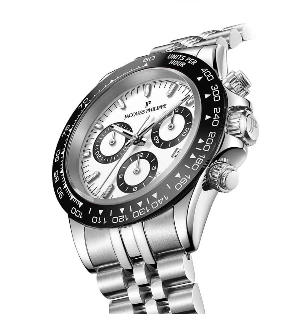 Швейцарские наручные часы Jacques Philippe JPQGC711326SBB сочетают в себе современный дизайн, надежность и функциональность, это стильные швейцарские часы с функцией хронографаХронографФункция позволяет измерять отрезки времени с особой точностью: часы, минуты, секунды. Верным признаком хронографа является наличие на циферблате 3 дополнительных окошек-счётчиков. и секундомераСекундомерСекундоме́р — прибор, способный измерять интервалы времени с точностью до долей секунды.. Корпус круглой формы диаметром 39 мм выполнен из прочной нержавеющей стали, а безельБезельВнешний ободок, закрепляющий стекло. В спортивных часах так называется поворотное кольцо с делениями на циферблате, выполняет роль таймера – замеряет отрезки времени на шкале. Неподвижный безель – элемент декора. Однонаправленно вращающийся безель на дайверских часах позволяет фиксировать моменты погружения и выныривания на поверхность. с элегантным черным IP-покрытиемIP-покрытиеМетод ионного напыления. Демонстрирует повышенную устойчивость к истиранию, окислению и химическим веществам. Под воздействием высокого давления и температуры около 1500°C молекулы металла надёжно соединяются с частицами корпуса часов., а сапфировое стеклоСапфировое стеклоПрочный и надёжный материал из кристалла сапфира синтетического происхождения, характеризующийся особой твёрдостью и устойчивостью к царапинам и повреждениям. надежно защищает белый циферблат от царапин и повреждений. Модель оснащена точным кварцевым механизмом RONDA 5030.D-4H, а также дополнительными функциями — тахиметромТахиметрРазмеченная шкала, располагается на ободке или безеле часов. Тахиметр позволяет рассчитать скорость на определённом участке пути, расстояние измеряется в километрах или милях. и индикатором даты, что делает часы не только стильным аксессуаром, но и практичным помощником на каждый день. Серебристый браслет шириной 20 мм удобно фиксируется на запястье с помощью застежки «бабочка»Застёжка "бабочка"Такой вид застёжки дополняется предохранителями, помогающими избежать случайного раскрытия браслета. Обладают изящным исполнением. . Стрелки имеют люминесцентное покрытиеЛюминесцентное покрытиеПозволяет считывать показания времени в темноте. Производители наносят на стрелки, часовые индексы, безель или поверхность циферблата светонакопительный состав, дающий холодное свечение. для удобства чтения времени в темноте. Водозащита 5 АТМ позволяет не снимать часы при дожде и случайных контактах с водой.