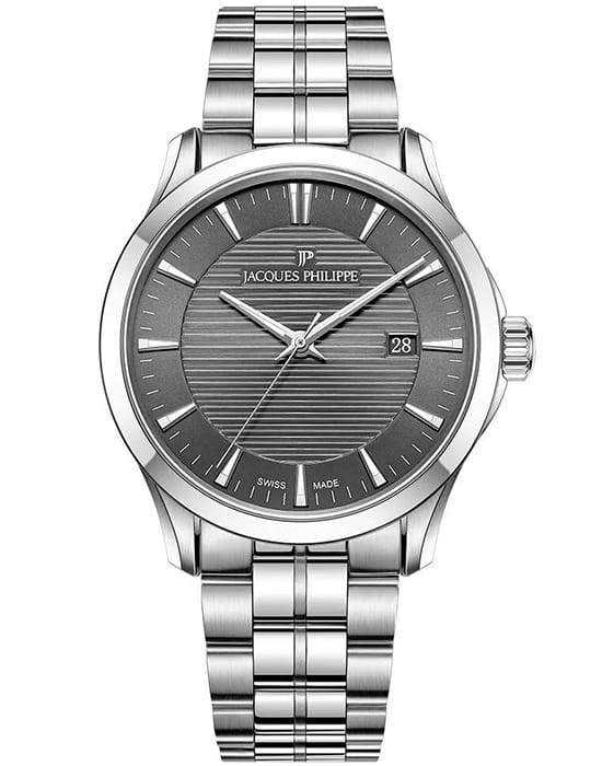 Jacques Philippe JPQGS791346 — стильные мужские часы в классическом формате с акцентом на надёжность и элегантность. Корпус круглой формы диаметром 40 мм из нержавеющей стали отличается утонченным силуэтом, обеспечивая комфорт при длительном ношении . Циферблат оформлен лаконично: тонкие стрелки и минималистичные часовые метки с люминесцентным покрытиемЛюминесцентное покрытиеПозволяет считывать показания времени в темноте. Производители наносят на стрелки, часовые индексы, безель или поверхность циферблата светонакопительный состав, дающий холодное свечение. подчёркивают строгий характер модели. Встроенная функция отображения даты придаёт часам практичность без лишнего визуального нагромождения. Поверхность защищает сапфировое стеклоСапфировое стеклоПрочный и надёжный материал из кристалла сапфира синтетического происхождения, характеризующийся особой твёрдостью и устойчивостью к царапинам и повреждениям. — устойчивое к царапинам и бликам. Внутри используется точный швейцарский кварцевый механизм, не требующий подзавода и сохраняющий стабильную работу без сложного обслуживания. Модель оснащена металлическим браслетом из нержавеющей стали в оттенке металлик на застёжке-бабочке с кнопкамиЗастёжка "бабочка"Такой вид застёжки дополняется предохранителями, помогающими избежать случайного раскрытия браслета. Обладают изящным исполнением. , что обеспечивает надёжную посадку и солидный внешний вид . Водозащита составляет до 5 ATM, — часы без проблем выдерживают случайный контакт с водой в повседневной эксплуатации . Jacques Philippe — гармоничное сочетание классического стиля, точного швейцарского кварца и практичности в одном надёжном аксессуаре.