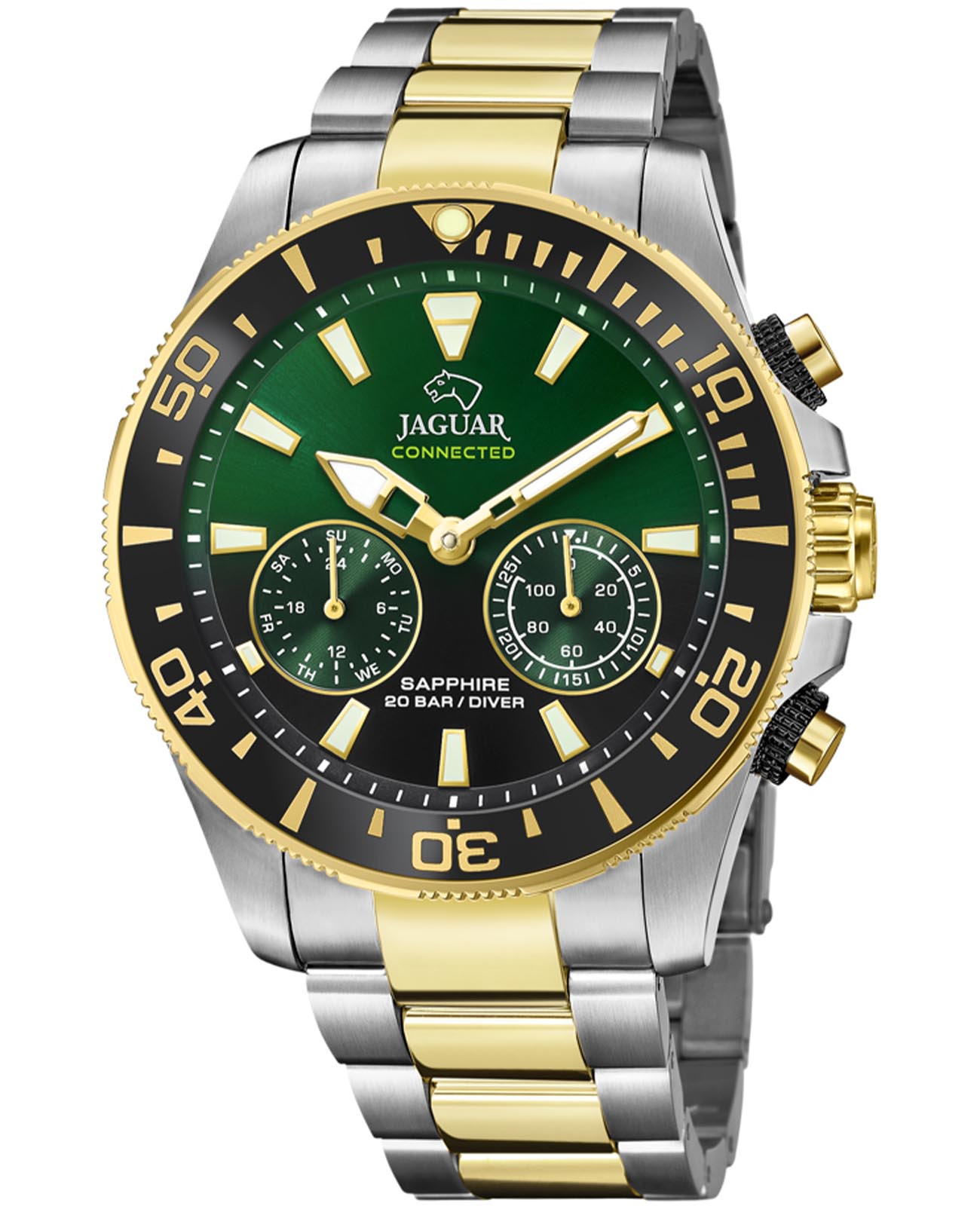 Мужские швейцарские часы Jaguar Connected J889/5. Сапфировое стеклоСапфировое стеклоПрочный и надёжный материал из кристалла сапфира синтетического происхождения, характеризующийся особой твёрдостью и устойчивостью к царапинам и повреждениям. устойчивое к мелким механическим повреждениям. Корпус часов изготовлен из нержавеющей стали. Стрелки и метки с люминесцентным покрытиемЛюминесцентное покрытиеПозволяет считывать показания времени в темноте. Производители наносят на стрелки, часовые индексы, безель или поверхность циферблата светонакопительный состав, дающий холодное свечение.. Календарь находится в положении 8 часов. Класс водозащиты: 200 метров, позволит плавать, нырять и заниматься другими водными видами спорта. Стальной браслет с частичным PVD-покрытиемPVDУльтратонкое покрытие наносится в технике вакуумного напыления, сочетает в себе нитрид титана особой прочности со слоем золота или оксида хрома. Несёт в себе декоративную или защитную функцию. на раскладной застёжкеРаскладная застёжкаТакой тип застёжки используется только на браслетах из металла. Она никогда не раскрывается полностью, происходит разделение на 2 и более частей. Раскладывающая застёжка снизит вероятность потери часов к минимуму.. БезельБезельВнешний ободок, закрепляющий стекло. В спортивных часах так называется поворотное кольцо с делениями на циферблате, выполняет роль таймера – замеряет отрезки времени на шкале. Неподвижный безель – элемент декора. Однонаправленно вращающийся безель на дайверских часах позволяет фиксировать моменты погружения и выныривания на поверхность. с PVD-покрытиемPVDУльтратонкое покрытие наносится в технике вакуумного напыления, сочетает в себе нитрид титана особой прочности со слоем золота или оксида хрома. Несёт в себе декоративную или защитную функцию.. За точный ход работы часов, из коллекции Connected, отвечает кварцевый гибридный механизм швейцарского производства со Смарт-Модулем. Данный тип механизма обеспечивает возможность подключить часы к телефону через Bluetooth и управлять большим рядом дополнительных функций на выбор с помошью приложения Jaguar. Дополнительные функции: отображение даты и дня недели, секундомер, таймер, GMT, шагомер, поиск телефона, включение/выключение звука телефона при входящих вызовах, переключение музыки, вибро-уведомления.