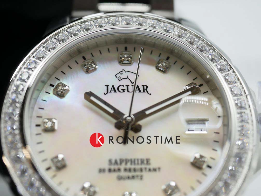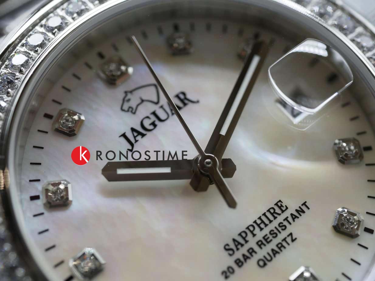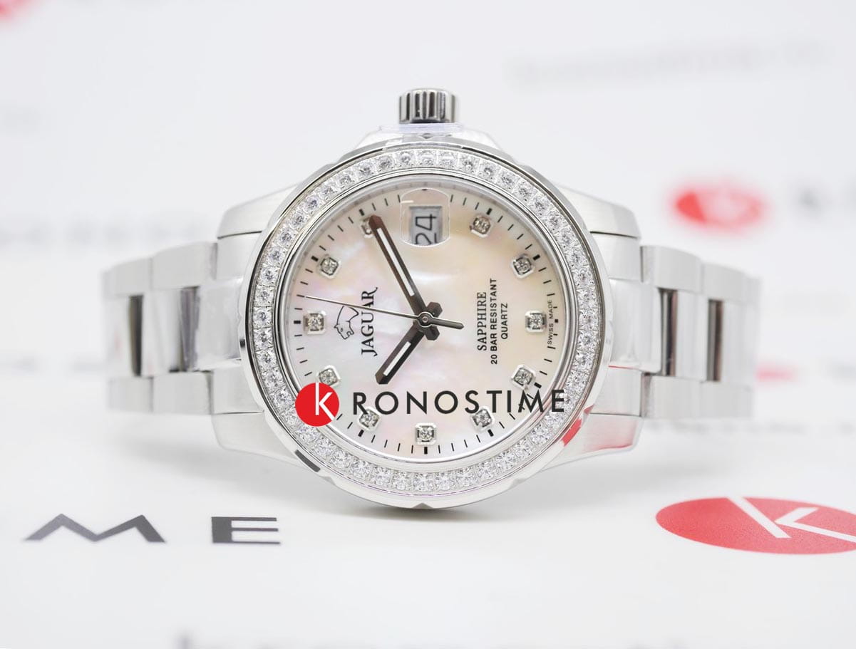 Женские швейцарские часы Jaguar Woman J892/1. Кварцевый швейцарский калибр Ronda 705. Сапфировое стеклоСапфировое стеклоПрочный и надёжный материал из кристалла сапфира синтетического происхождения, характеризующийся особой твёрдостью и устойчивостью к царапинам и повреждениям. устойчивое к мелким механическим повреждениям. Корпус и браслет часов изготовлены из нержавеющей стали, с безелем, инкрустированным цирконием. Стрелки с люминесцентным покрытиемЛюминесцентное покрытиеПозволяет считывать показания времени в темноте. Производители наносят на стрелки, часовые индексы, безель или поверхность циферблата светонакопительный состав, дающий холодное свечение.. Окошко даты находится в положении 3 часа. Класс водозащиты: 200 метров, позволит плавать, нырять и заниматься другими водными видами спорта. Стальной браслет на раскладной застёжкеРаскладная застёжкаТакой тип застёжки используется только на браслетах из металла. Она никогда не раскрывается полностью, происходит разделение на 2 и более частей. Раскладывающая застёжка снизит вероятность потери часов к минимуму.. Циферблат украшен кристаллами в роли часовых индексов.