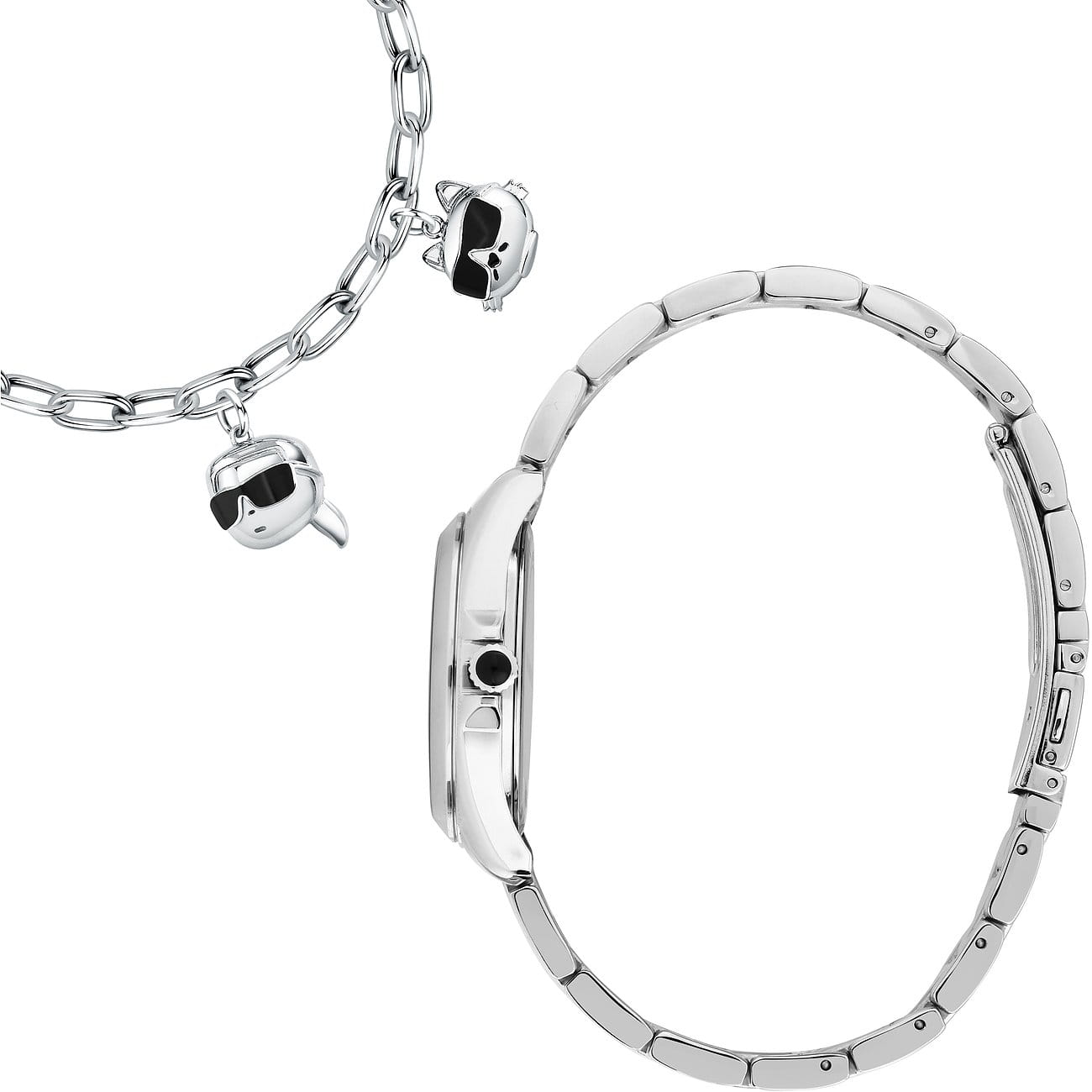 Женские элегантные часы Karl Lagerfeld Round Essentials R0553101516, кварцевый механизм с высокой точностью. Минеральное стеклоМинеральное стеклоМинеральное стекло представляет собой искусственно выращенный минерал кварца. Такое стекло отличается особой устойчивостью к повреждениям и царапинам. Уступает по некоторым качествам сапфировому стеклу. устойчивое к появлению царапин, обладающее высокой прозрачностью. Изысканный корпус изготовлен из нержавеющей стали. Лаконичные центральные часовая, минутная и секундная стрелки. Водонепроницаемость 5 АТМ позволяет использовать часы в повседневных условиях — при мытье рук или под лёгким дождём. Стальной браслет c раскладной застёжкойРаскладная застёжкаТакой тип застёжки используется только на браслетах из металла. Она никогда не раскрывается полностью, происходит разделение на 2 и более частей. Раскладывающая застёжка снизит вероятность потери часов к минимуму., обеспечивающей комфорт и уверенную фиксацию на запястье, а также добавляя завершающий штрих к этому стильному аксессуару. Стрелки и метки оснащены люминесцентным покрытиемЛюминесцентное покрытиеПозволяет считывать показания времени в темноте. Производители наносят на стрелки, часовые индексы, безель или поверхность циферблата светонакопительный состав, дающий холодное свечение., обеспечивающим хорошую читаемость в темноте. Циферблат с кристаллами подчёркивает изысканный характер часов, создавая универсальный образ, подходящий как для повседневных ситуаций, так и для особых случаев. Аккуратное окошко даты на отметке «3 часов». Набор с браслетом из нержавеющей стали.