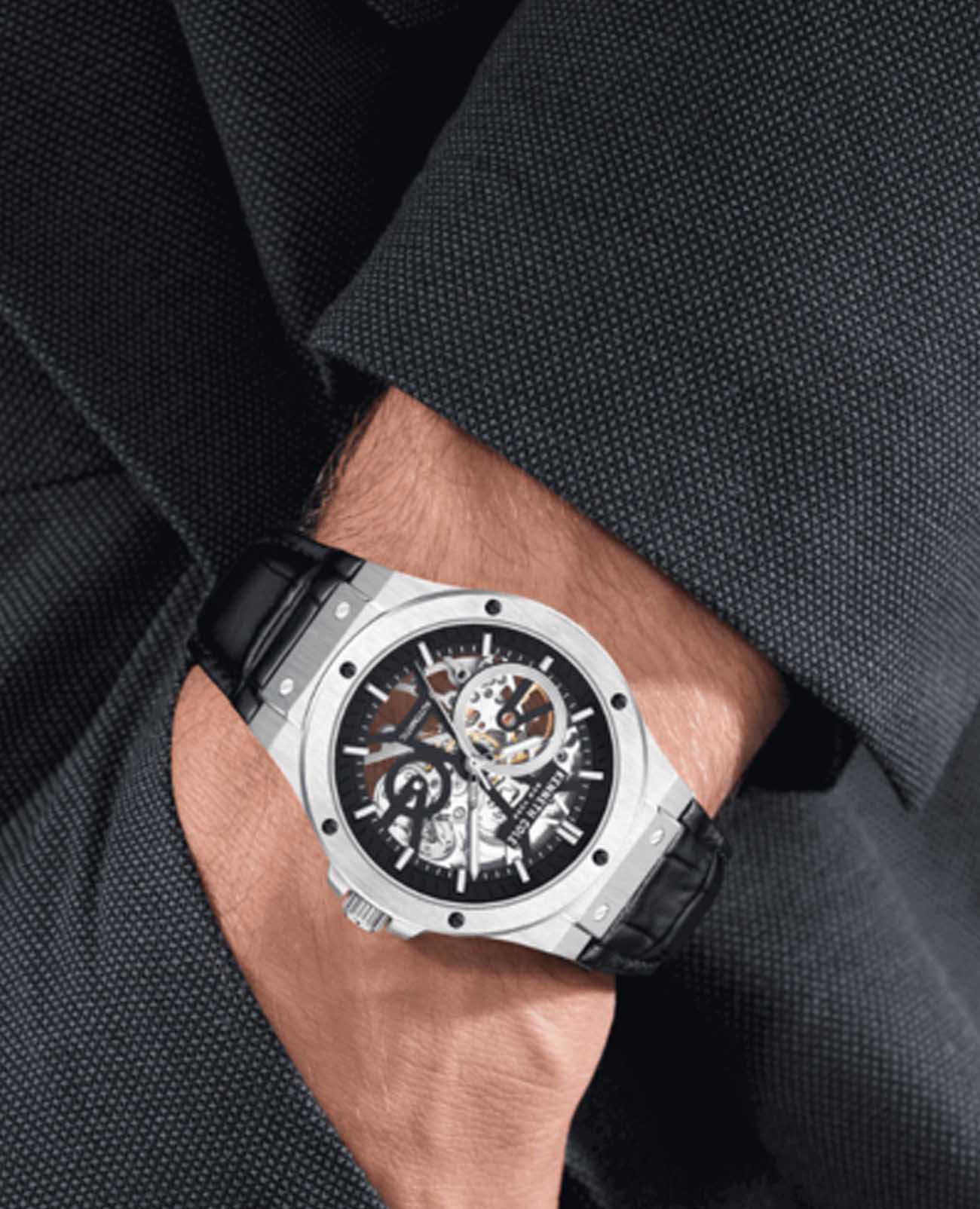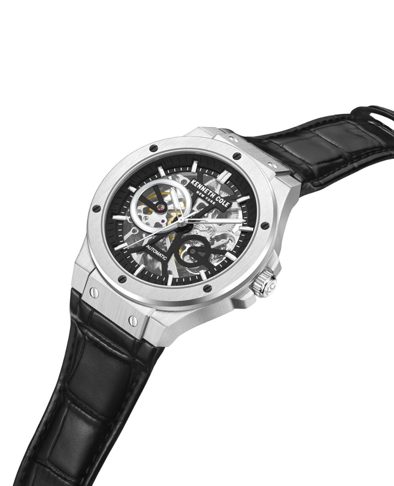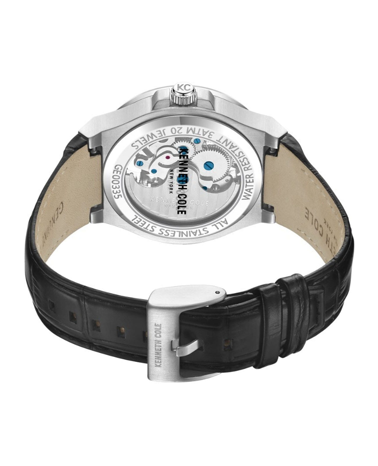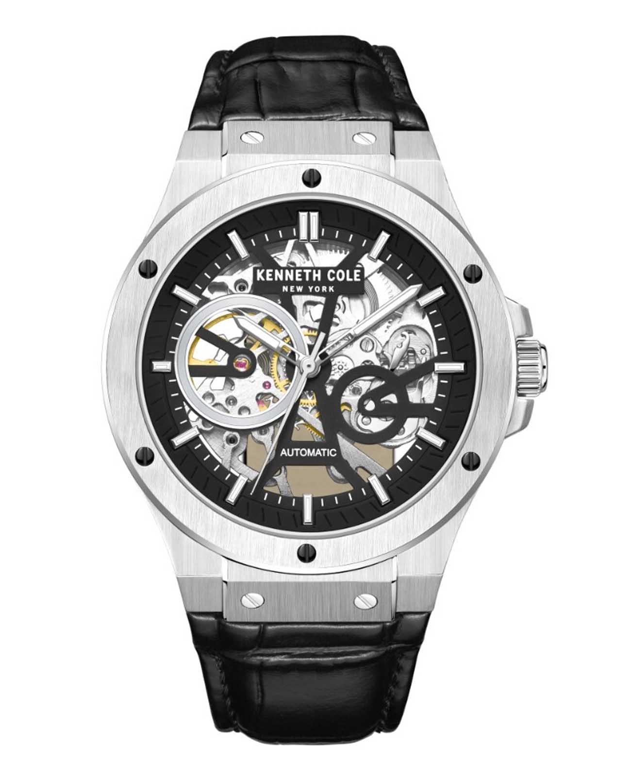 Мужские механические часы-скелетоны с минеральным стекломМинеральное стеклоМинеральное стекло представляет собой искусственно выращенный минерал кварца. Такое стекло отличается особой устойчивостью к повреждениям и царапинам. Уступает по некоторым качествам сапфировому стеклу. Kenneth Cole Automatic KCWGE0033505, механический механизм (автоматический калибр) с высокой точностью. Корпус часов изготовлен из стали. Стрелки с люминесцентным покрытиемЛюминесцентное покрытиеПозволяет считывать показания времени в темноте. Производители наносят на стрелки, часовые индексы, безель или поверхность циферблата светонакопительный состав, дающий холодное свечение.. Класс водозащиты: 30 метров, позволит защитить корпус от случайных брызг или капель дождя. Кожаный ремешок на стандартной застежке.