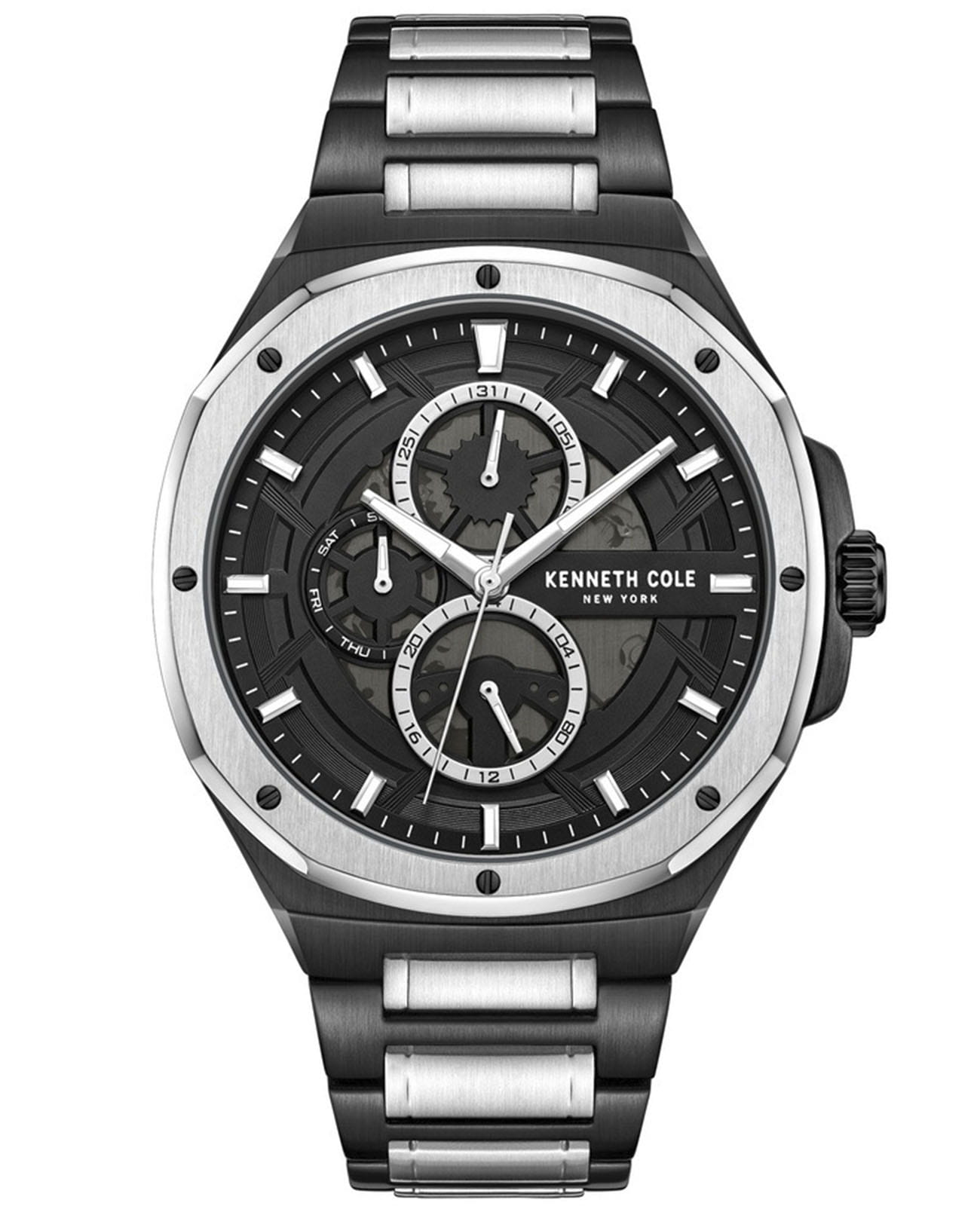 Мужские кварцевые часы Kenneth Cole KCWGK0047203 из коллекции Dress Sport — это стильный и функциональный аксессуар с современным дизайном. Корпус размером 43 мм выполнен из нержавеющей стали 316L с IP-покрытиемIP-покрытиеМетод ионного напыления. Демонстрирует повышенную устойчивость к истиранию, окислению и химическим веществам. Под воздействием высокого давления и температуры около 1500°C молекулы металла надёжно соединяются с частицами корпуса часов.. Циферблат чёрного цвета оформлен метками в виде штрихов и дополнен функцией индикацией даты и 12/24-часовым форматом времени. Стрелки и метки оснащены люминесцентным покрытиемЛюминесцентное покрытиеПозволяет считывать показания времени в темноте. Производители наносят на стрелки, часовые индексы, безель или поверхность циферблата светонакопительный состав, дающий холодное свечение., обеспечивающим хорошую читаемость в темноте. Циферблат защищён минеральным стекломМинеральное стеклоМинеральное стекло представляет собой искусственно выращенный минерал кварца. Такое стекло отличается особой устойчивостью к повреждениям и царапинам. Уступает по некоторым качествам сапфировому стеклу.. Часы оснащены Браслетом из нержавеющей стали с IP-покрытиемIP-покрытиеМетод ионного напыления. Демонстрирует повышенную устойчивость к истиранию, окислению и химическим веществам. Под воздействием высокого давления и температуры около 1500°C молекулы металла надёжно соединяются с частицами корпуса часов. на раскладной застёжкеРаскладная застёжкаТакой тип застёжки используется только на браслетах из металла. Она никогда не раскрывается полностью, происходит разделение на 2 и более частей. Раскладывающая застёжка снизит вероятность потери часов к минимуму.. Водонепроницаемость 50 м позволяет использовать часы для повседневного ношения. Надёжный выбор для тех, кто ценит современный стиль и практичность.