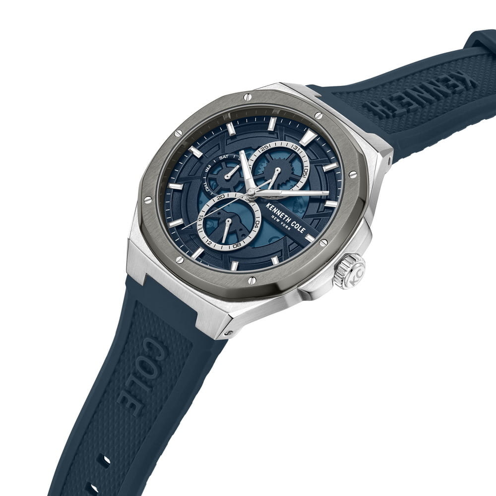 Мужские кварцевые часы Kenneth Cole KCWGQ0047201 — это стильный и функциональный аксессуар с современным дизайном. Корпус диаметром 43 мм выполнен из нержавеющей стали. Безель с IP-покрытиемIP-покрытиеМетод ионного напыления. Демонстрирует повышенную устойчивость к истиранию, окислению и химическим веществам. Под воздействием высокого давления и температуры около 1500°C молекулы металла надёжно соединяются с частицами корпуса часов. в серо-чёрных тонах. Циферблат синего цвета оформлен метками в виде штрихов. Стрелки и метки оснащены люминесцентным покрытиемЛюминесцентное покрытиеПозволяет считывать показания времени в темноте. Производители наносят на стрелки, часовые индексы, безель или поверхность циферблата светонакопительный состав, дающий холодное свечение., обеспечивающим хорошую читаемость в темноте. Циферблат защищён минеральным стекломМинеральное стеклоМинеральное стекло представляет собой искусственно выращенный минерал кварца. Такое стекло отличается особой устойчивостью к повреждениям и царапинам. Уступает по некоторым качествам сапфировому стеклу.. Часы оснащены силиконовым ремешком синего цвета с классической пряжкой. Водонепроницаемость 50 м позволяет использовать часы для плавания и повседневного ношения. Универсальный выбор для тех, кто ценит выразительный дизайн и надёжность.
