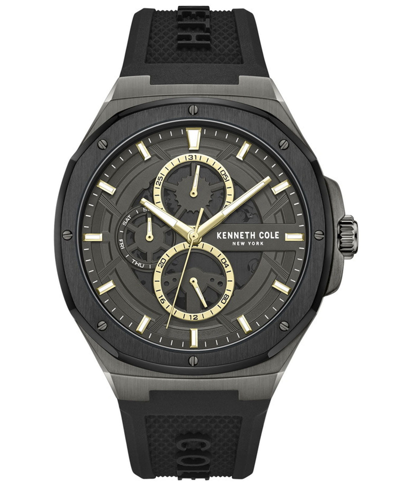 Мужские кварцевые часы Kenneth Cole KCWGQ0047202 — это стильный и функциональный аксессуар с выразительным дизайном. Корпус размером 43 мм выполнен из стали с IP-покрытиемIP-покрытиеМетод ионного напыления. Демонстрирует повышенную устойчивость к истиранию, окислению и химическим веществам. Под воздействием высокого давления и температуры около 1500°C молекулы металла надёжно соединяются с частицами корпуса часов. в стально-чёрных тонах. Циферблат серого цвета оформлен метками в виде штрихов. Стрелки и метки оснащены люминесцентным покрытиемЛюминесцентное покрытиеПозволяет считывать показания времени в темноте. Производители наносят на стрелки, часовые индексы, безель или поверхность циферблата светонакопительный состав, дающий холодное свечение., обеспечивающим хорошую читаемость в темноте. Циферблат защищён минеральным стекломМинеральное стеклоМинеральное стекло представляет собой искусственно выращенный минерал кварца. Такое стекло отличается особой устойчивостью к повреждениям и царапинам. Уступает по некоторым качествам сапфировому стеклу.. Часы оснащены силиконовым ремешком чёрного цвета со стандартной застёжкой. Водонепроницаемость 50 м позволяет использовать часы для плавания и повседневного ношения. Надёжный выбор для тех, кто ценит современный стиль и функциональность.