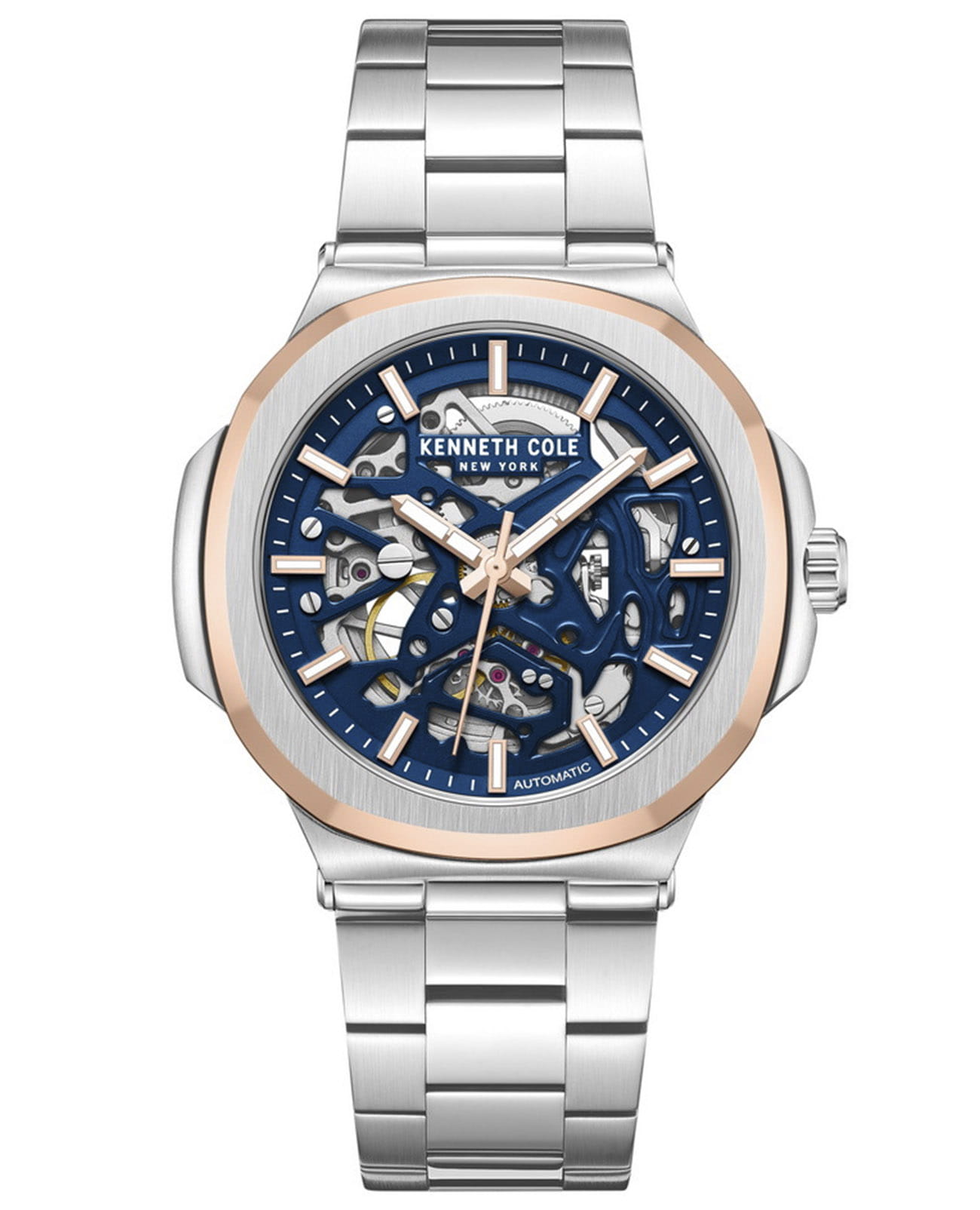 Мужские механические часы с автоподзаводом Kenneth Cole KCWGY0046201 — это выразительный аксессуар, сочетающий современный дизайн и инженерную изысканность. Корпус размером 44 мм выполнен из нержавеющей стали. Безель с частичным IP-покрытиемIP-покрытиеМетод ионного напыления. Демонстрирует повышенную устойчивость к истиранию, окислению и химическим веществам. Под воздействием высокого давления и температуры около 1500°C молекулы металла надёжно соединяются с частицами корпуса часов. розового золота и стального цвета. Циферблат синего цвета частично скелетонизирован, что позволяет наблюдать за работой механизма, добавляя модели динамики и технологичности. Циферблат защищён минеральным стекломМинеральное стеклоМинеральное стекло представляет собой искусственно выращенный минерал кварца. Такое стекло отличается особой устойчивостью к повреждениям и царапинам. Уступает по некоторым качествам сапфировому стеклу. и оформлен метками в виде штрихов. Стрелки и метки оснащены люминесцентным покрытиемЛюминесцентное покрытиеПозволяет считывать показания времени в темноте. Производители наносят на стрелки, часовые индексы, безель или поверхность циферблата светонакопительный состав, дающий холодное свечение., обеспечивающим хорошую читаемость в темноте. Часы оснащены стальным браслетом с раскладной застёжкойРаскладная застёжкаТакой тип застёжки используется только на браслетах из металла. Она никогда не раскрывается полностью, происходит разделение на 2 и более частей. Раскладывающая застёжка снизит вероятность потери часов к минимуму.. Водонепроницаемость 30 м позволяет использовать часы в повседневных условиях, защищая от случайных брызг и капель дождя. Сочетание строгого стиля и детального исполнения делает эти часы заметным элементом образа.