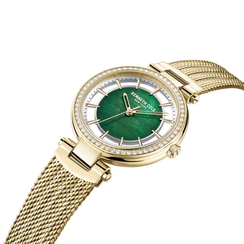 Женские кварцевые часы с минеральным стекломМинеральное стеклоМинеральное стекло представляет собой искусственно выращенный минерал кварца. Такое стекло отличается особой устойчивостью к повреждениям и царапинам. Уступает по некоторым качествам сапфировому стеклу. Kenneth Cole Transparency KCWLG2223003, кварцевый механизм с высокой точностью. Класс водозащиты: 30 метров, позволит защитить корпус от случайных брызг или капель дождя. Корпус и браслет часов изготовлен из стали с IP-покрытиемIP-покрытиеМетод ионного напыления. Демонстрирует повышенную устойчивость к истиранию, окислению и химическим веществам. Под воздействием высокого давления и температуры около 1500°C молекулы металла надёжно соединяются с частицами корпуса часов.. Корпус инкрустирован кристаллами. Рифленая заводная головка. Браслет с раскладной застёжкойРаскладная застёжкаТакой тип застёжки используется только на браслетах из металла. Она никогда не раскрывается полностью, происходит разделение на 2 и более частей. Раскладывающая застёжка снизит вероятность потери часов к минимуму..