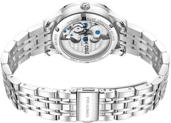 Американские женские часы-скелетоны с минеральным стекломМинеральное стеклоМинеральное стекло представляет собой искусственно выращенный минерал кварца. Такое стекло отличается особой устойчивостью к повреждениям и царапинам. Уступает по некоторым качествам сапфировому стеклу. Kenneth Cole New York KCWLL0016604, механический механизм (автоматический калибр) с высокой точностью. Класс водозащиты: 30 метров, позволит защитить корпус от случайных брызг или капель дождя. Корпус часов изготовлен из стали. Стальной браслет на раскладной застёжкеРаскладная застёжкаТакой тип застёжки используется только на браслетах из металла. Она никогда не раскрывается полностью, происходит разделение на 2 и более частей. Раскладывающая застёжка снизит вероятность потери часов к минимуму..