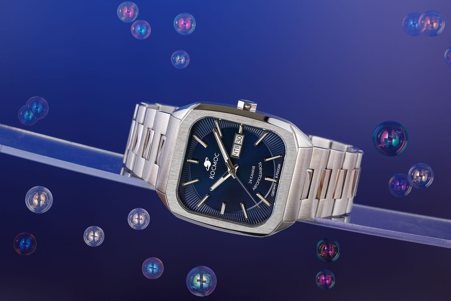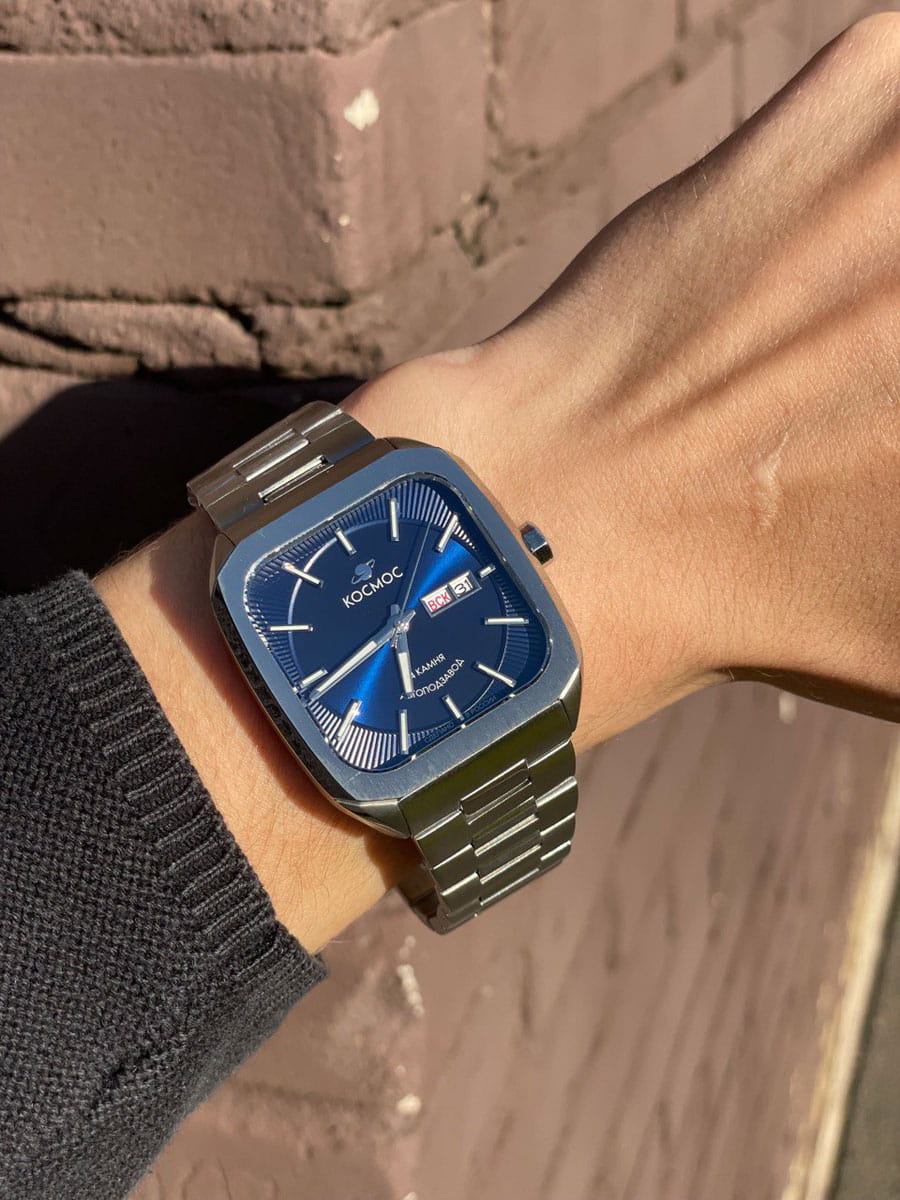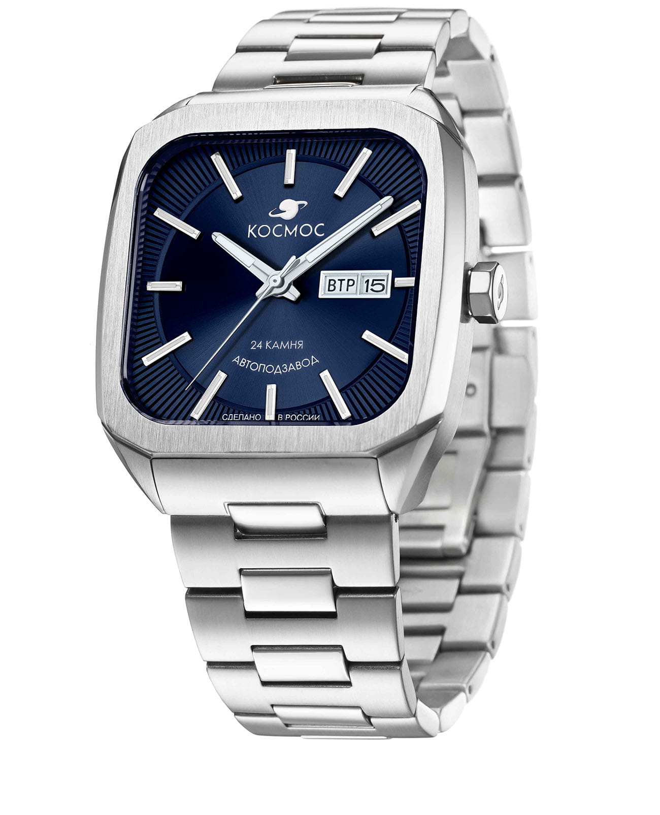 Мужские наручные часы Космос Марсоход K 213.10.36 — это уникальная лимитированная серия, посвященная аппарату, способному передвигаться по поверхности Красной планеты. Марсоход ассоциируется с брутальностью, мастерством и технической сложностью. Наша страна дважды запускала подобные аппараты еще в 70-х годах прошлого века. Дизайн часов серии Марсоход вдохновлен лучшими работами советских мастеров, сочетая современные технологии часового искусства с обаянием стиля ретро. Корпус в форме квадрата с закругленными углами выполнен из нержавеющей стали марки 316L, украшенной зеркальной полировкой и сатинированием. Удобная заводная головка имеет форму гайки, что добавляет модели индустриальный шарм. Задняя крышка прозрачная, закрепленная на четырех винтах, и позволяет увидеть работу механизма TMI с подвижным ротором, на котором гравируется надпись «Сделано в России». Также здесь представлена гравировка с изображением космонавта, придающая часам особую значимость. Водостойкость достигает 10 атм (WR100), что позволяет использовать часы при плавании и других водных видах спорта. На задней крышке указан индивидуальный номер модели в формате от 01/50 до 50/50 (первый выпуск) или от 051/200 до 200/200 (второй выпуск). Объемный циферблат состоит из двух уровней. В центре движутся три стрелки, часовая и минутная из которых имеют люминесцентное покрытиеЛюминесцентное покрытиеПозволяет считывать показания времени в темноте. Производители наносят на стрелки, часовые индексы, безель или поверхность циферблата светонакопительный состав, дающий холодное свечение., позволяющее определять время даже в темноте. Индексы накладные, как и стальная рамка, выделяющая сдвоенное окошко даты и дня недели, где день недели отображается на двух языках — русском и английском. Циферблат защищен прочным сапфировым стеклом с антибликовым покрытиемСапфировое стеклоПрочный и надёжный материал из кристалла сапфира синтетического происхождения, характеризующийся особой твёрдостью и устойчивостью к царапинам и повреждениям., обеспечивающим отличную читаемость показаний в любых условиях. Браслет изготовлен из литых стальных звеньев нержавеющей стали 316L и оснащен удобной застёжкой «бабочка» с кнопкамиЗастёжка "бабочка"Такой вид застёжки дополняется предохранителями, помогающими избежать случайного раскрытия браслета. Обладают изящным исполнением. , которая сводит к минимуму вероятность потери. Заводная головка, застежка и браслет украшены фирменным логотипом бренда. Коллекция Марсоход — идеальный выбор для ценителей истории космических достижений и современных технологий.