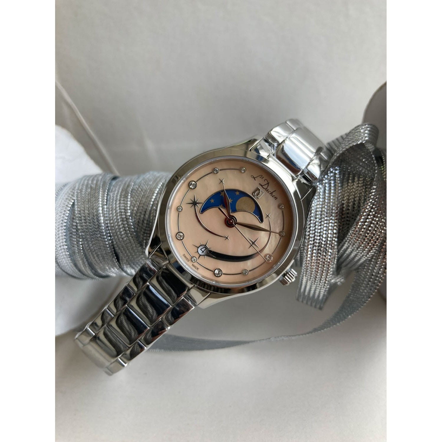 Женские кварцевые часы L'Duchen из коллекции Perseides — это волшебный аксессуар, вдохновлённый космическим зрелищем метеорного потока. Корпус диаметром 34 мм выполнен из нержавеющей стали 316L с эффектным чередованием полированных и матовых поверхностей. Циферблат бежевого цвета изготовлен из натурального перламутра, природная текстура которого создаёт уникальный фон. Центральная композиция напоминает падающие звёзды — накладные элементы и фианиты разного размера символизируют метеоры. Окошко даты в верхней части циферблата оформлено в виде звезды, а указатель элегантно выделен металлической рамкой. Циферблат защищён сапфировым стекломСапфировое стеклоПрочный и надёжный материал из кристалла сапфира синтетического происхождения, характеризующийся особой твёрдостью и устойчивостью к царапинам и повреждениям.. Часы оснащены стальным браслетом из литых звеньев с застёжкой «бабочка» с кнопкамиЗастёжка "бабочка"Такой вид застёжки дополняется предохранителями, помогающими избежать случайного раскрытия браслета. Обладают изящным исполнением. . Заводная головка и задняя крышка также декорированы фирменным тиснением. Водонепроницаемость 50 м позволяет использовать часы в повседневных условиях.