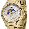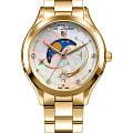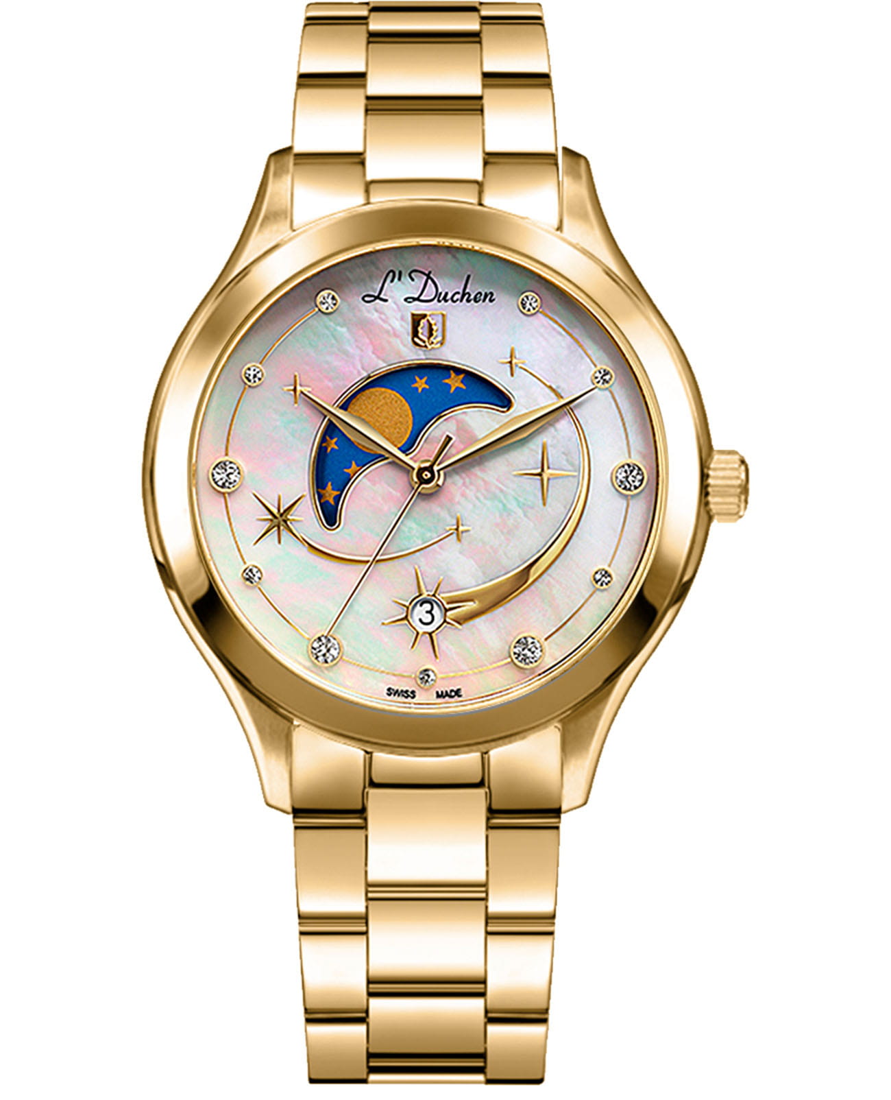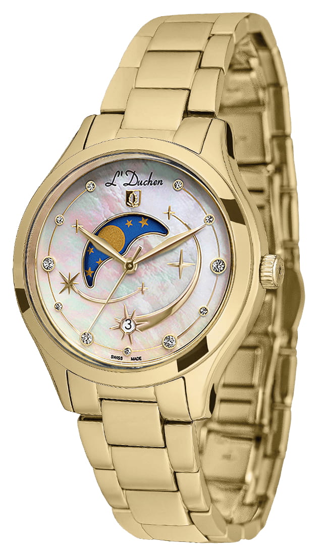 Женские кварцевые часы L'Duchen из коллекции Perseides — это воплощение роскоши и изысканности. Корпус диаметром 34 мм выполнен из нержавеющей стали 316L с PVD-покрытиемPVDУльтратонкое покрытие наносится в технике вакуумного напыления, сочетает в себе нитрид титана особой прочности со слоем золота или оксида хрома. Несёт в себе декоративную или защитную функцию. жёлтого золота и эффектным чередованием полированных и матовых поверхностей. Циферблат белого цвета изготовлен из натурального перламутра, природная текстура которого создаёт уникальный фон. Центральная композиция украшена накладными элементами и фианитами разного размера, символизирующими падающие звёзды метеорного потока Персеиды. Окошко даты в верхней части циферблата оформлено в виде звезды, а указатель фазы луны элегантно выделен металлической рамкой. Циферблат защищён сапфировым стекломСапфировое стеклоПрочный и надёжный материал из кристалла сапфира синтетического происхождения, характеризующийся особой твёрдостью и устойчивостью к царапинам и повреждениям.. Часы оснащены стальным браслетом с PVD-покрытиемPVDУльтратонкое покрытие наносится в технике вакуумного напыления, сочетает в себе нитрид титана особой прочности со слоем золота или оксида хрома. Несёт в себе декоративную или защитную функцию. жёлтого золота и застёжкой «бабочка» с кнопкамиЗастёжка "бабочка"Такой вид застёжки дополняется предохранителями, помогающими избежать случайного раскрытия браслета. Обладают изящным исполнением. , украшенной логотипом бренда — дубовым листом, символом мудрости и долговечности. Заводная головка и задняя крышка также декорированы фирменным тиснением. Водонепроницаемость 50 м позволяет использовать часы в повседневных условиях.