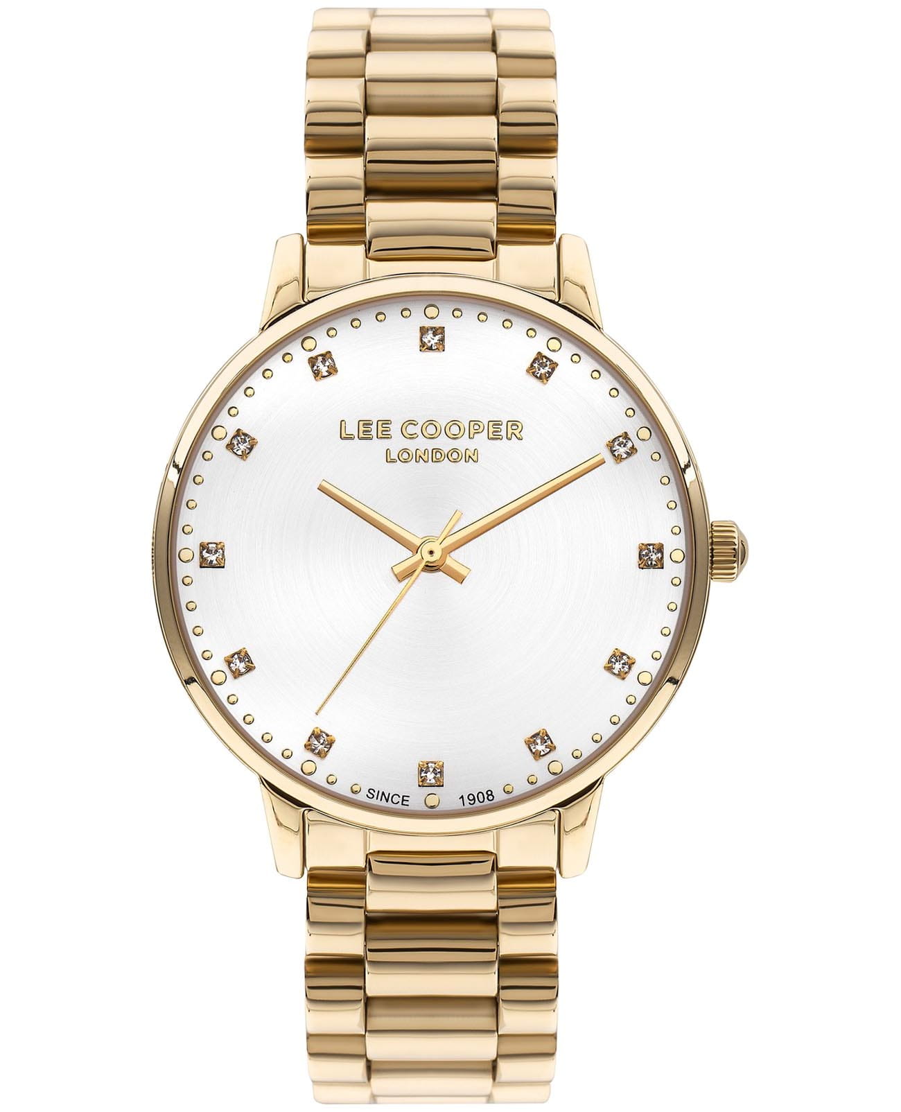 Женские часы Lee Cooper LC07548.130 — это стильное сочетание элегантности и современного дизайна. Круглый корпус диаметром 36 мм выполнен из суперметалла с IP-покрытиемIP-покрытиеМетод ионного напыления. Демонстрирует повышенную устойчивость к истиранию, окислению и химическим веществам. Под воздействием высокого давления и температуры около 1500°C молекулы металла надёжно соединяются с частицами корпуса часов. золотого цвета, что придает модели особый блеск. Серебристый циферблат защищен минеральным стекломМинеральное стеклоМинеральное стекло представляет собой искусственно выращенный минерал кварца. Такое стекло отличается особой устойчивостью к повреждениям и царапинам. Уступает по некоторым качествам сапфировому стеклу., обеспечивающим устойчивость к царапинам и украшен цирконами в виде меток. Часы оснащены надежным кварцевым механизмом, а металлический браслет с IP-покрытиемIP-покрытиеМетод ионного напыления. Демонстрирует повышенную устойчивость к истиранию, окислению и химическим веществам. Под воздействием высокого давления и температуры около 1500°C молекулы металла надёжно соединяются с частицами корпуса часов. на раскладной застёжкеРаскладная застёжкаТакой тип застёжки используется только на браслетах из металла. Она никогда не раскрывается полностью, происходит разделение на 2 и более частей. Раскладывающая застёжка снизит вероятность потери часов к минимуму. гарантирует комфортную посадку на запястье. Водозащита 30 метров защищает модель от случайных брызг и дождя. Lee Cooper — отличный выбор для тех, кто ценит утонченность и качество.