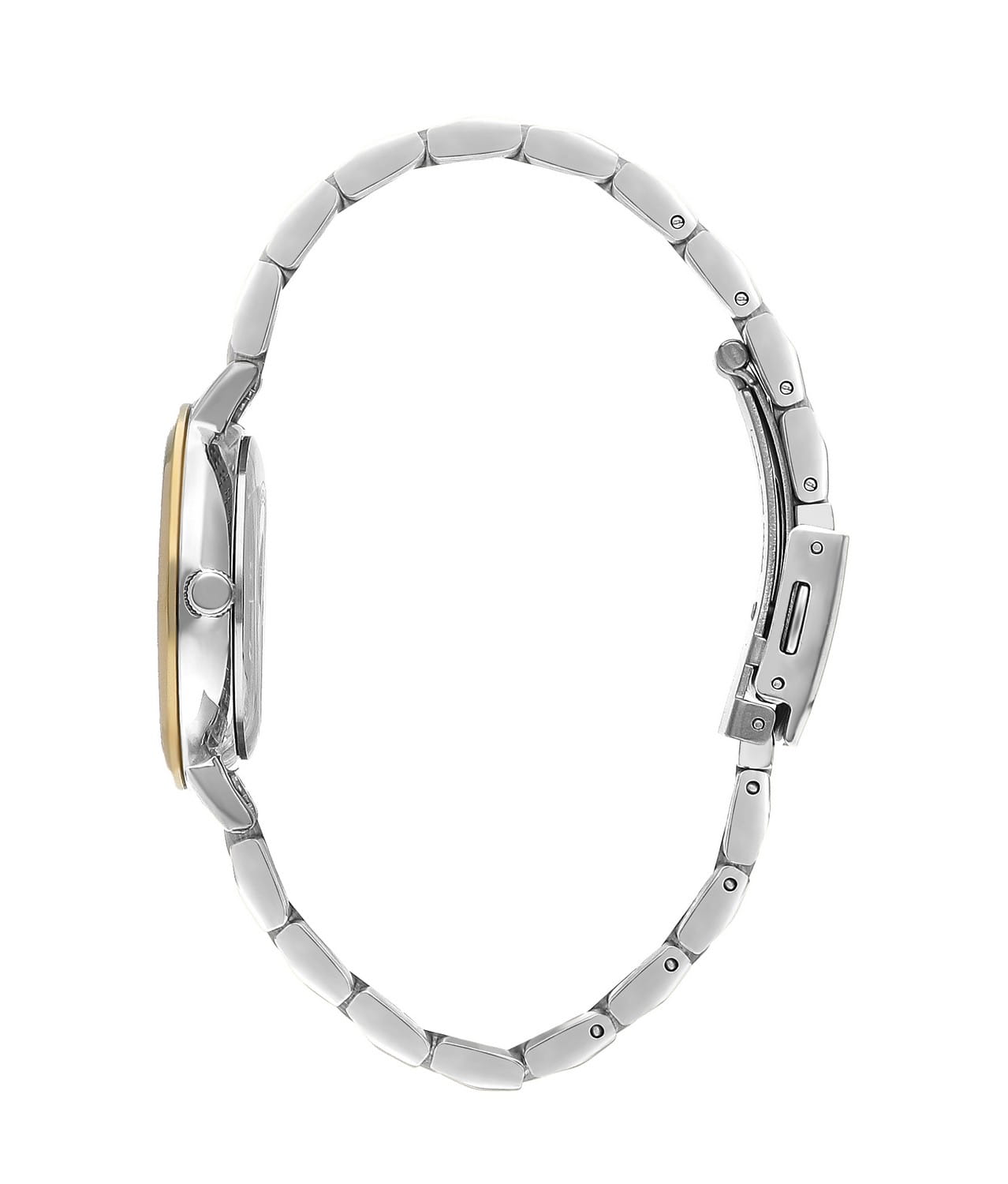 Женские часы Lee Cooper LC07857.230 — это стильное сочетание элегантности и современного дизайна. Изящный круглый корпус диаметром 34 мм выполнен из суперметалла с безелемБезельВнешний ободок, закрепляющий стекло. В спортивных часах так называется поворотное кольцо с делениями на циферблате, выполняет роль таймера – замеряет отрезки времени на шкале. Неподвижный безель – элемент декора. Однонаправленно вращающийся безель на дайверских часах позволяет фиксировать моменты погружения и выныривания на поверхность. с IP-покрытиемIP-покрытиеМетод ионного напыления. Демонстрирует повышенную устойчивость к истиранию, окислению и химическим веществам. Под воздействием высокого давления и температуры около 1500°C молекулы металла надёжно соединяются с частицами корпуса часов. золотого цвета, что придает модели особый блеск. Серебристый циферблат защищен минеральным стекломМинеральное стеклоМинеральное стекло представляет собой искусственно выращенный минерал кварца. Такое стекло отличается особой устойчивостью к повреждениям и царапинам. Уступает по некоторым качествам сапфировому стеклу., обеспечивающим устойчивость к царапинам. Метки в виде штрихов. Часы оснащены надежным кварцевым механизмом, а стальной браслет с частичным IP-покрытиемIP-покрытиеМетод ионного напыления. Демонстрирует повышенную устойчивость к истиранию, окислению и химическим веществам. Под воздействием высокого давления и температуры около 1500°C молекулы металла надёжно соединяются с частицами корпуса часов. на раскладной застёжкеРаскладная застёжкаТакой тип застёжки используется только на браслетах из металла. Она никогда не раскрывается полностью, происходит разделение на 2 и более частей. Раскладывающая застёжка снизит вероятность потери часов к минимуму. гарантирует комфортную посадку на запястье. Водозащита 30 метров защищает модель от случайных брызг и дождя. В комплекте к часам идет дополнительный браслет. Lee Cooper — отличный выбор для тех, кто ценит утонченность и качество.