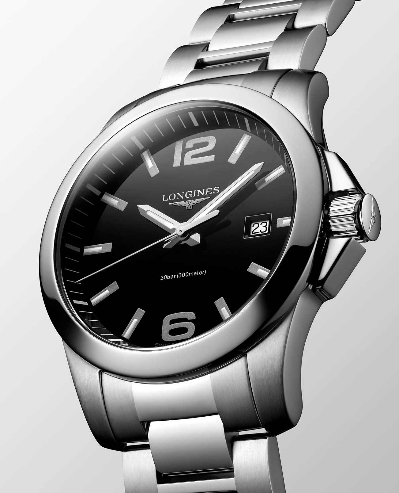 Часы Longines Conquest L3.759.4.58.6 сочетают спортивную элегантность и высокую функциональность, характерные для коллекции Conquest. Корпус диаметром 41 мм выполнен из нержавеющей стали с водозащитой до 30 бар (300 метров). Завинчивающаяся заводная головка и задняя крышка подчёркивают надёжность. Чёрный лакированный циферблат с полированной отделкой оснащён накладными арабскими цифрами и индексами, индексы с люминесцентным покрытиемЛюминесцентное покрытиеПозволяет считывать показания времени в темноте. Производители наносят на стрелки, часовые индексы, безель или поверхность циферблата светонакопительный состав, дающий холодное свечение., а также окошком даты в положении «3 часа». Циферблат защищён сапфировым стекломСапфировое стеклоПрочный и надёжный материал из кристалла сапфира синтетического происхождения, характеризующийся особой твёрдостью и устойчивостью к царапинам и повреждениям. с антибликовым покрытиемАнтибликовое покрытиеСлой оксида металла в 0,13-0,3 микрон, благодаря которому стекло часов не бликует и не отражает свет. Антибликовое покрытие уменьшает отражение света в 10 раз, обеспечивая отличную читаемость показателей циферблата.. Модель оснащена кварцевым механизмом Longines L157 с функцией индикации окончания срока службы батареи EOLEOLПредставляет собой систему, уведомляющую владельца часов о необходимости замены элемента питания. За 2 недели до полного разряда батарейки секундная стрелка перестаёт ходить чётко и начинает перепрыгивать на 3-4 деления.. Окошко даты расположено в позиции «3 часа». Браслет из нержавеющей стали с застёжкой бабочкойЗастёжка "бабочка"Такой вид застёжки дополняется предохранителями, помогающими избежать случайного раскрытия браслета. Обладают изящным исполнением. и механизмом открытия с кнопками обеспечивает комфортное и надёжное ношение. Эти часы идеально подходят для тех, кто ценит надёжность, спортивный стиль и элегантность.