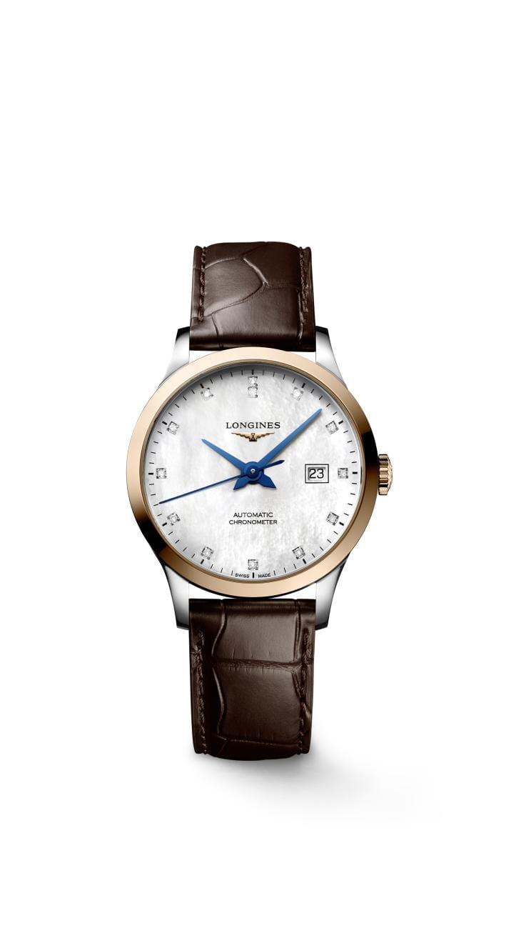 Женские швейцарские механические часы Longines Record Collection L2.321.5.87.2 помогут наделить образ элегантностью. Аксессуар имеет официальный сертификат хронометра COSCСертификат COSCОфициальный сертификат, подтверждающий то, что часы ходят с особо высокой точностью. Для получения документа часы подвергаются тестовым испытаниям, разработанным швейцарским институтом тестирования хронометров COSC. Допустимая норма для механических часов -4/+6 секунд в день, для кварцевых моделей +/- 0,07 секунд в день., ведь высокую точность хода обеспечивает швейцарский автоматический калибр L592.4 с монокристаллической кремниевой спиралью. Корпус выполнен из стали 316L.  БезельБезельВнешний ободок, закрепляющий стекло. В спортивных часах так называется поворотное кольцо с делениями на циферблате, выполняет роль таймера – замеряет отрезки времени на шкале. Неподвижный безель – элемент декора. Однонаправленно вращающийся безель на дайверских часах позволяет фиксировать моменты погружения и выныривания на поверхность. из 18-ти каратного золота18-каратное золотоОбозначение по каратной системе пробирования, оно показывает, сколько драгоценного металла содержится в изделии. 18 карат - в составе 75% чистого золота, соответствует 750 пробе.