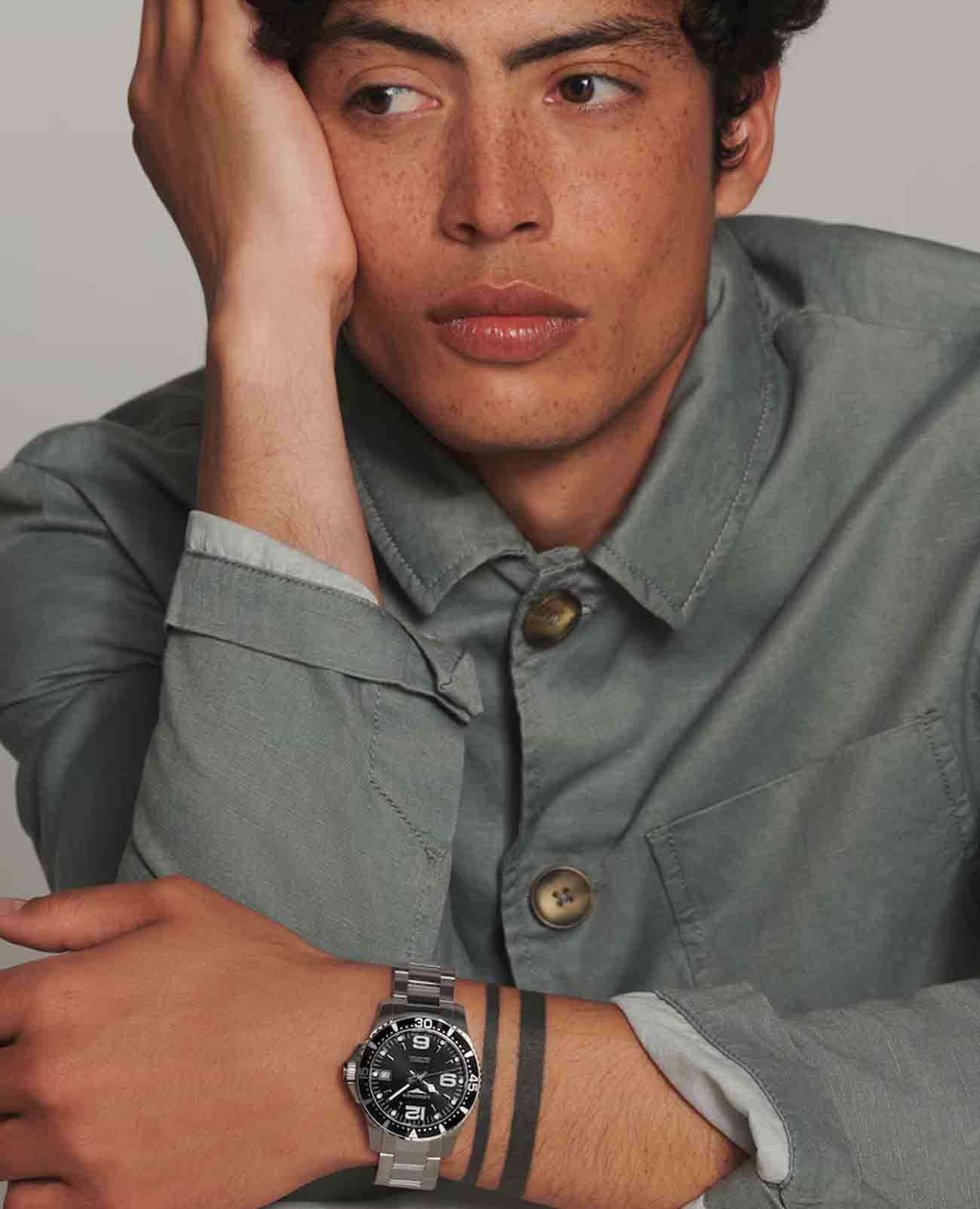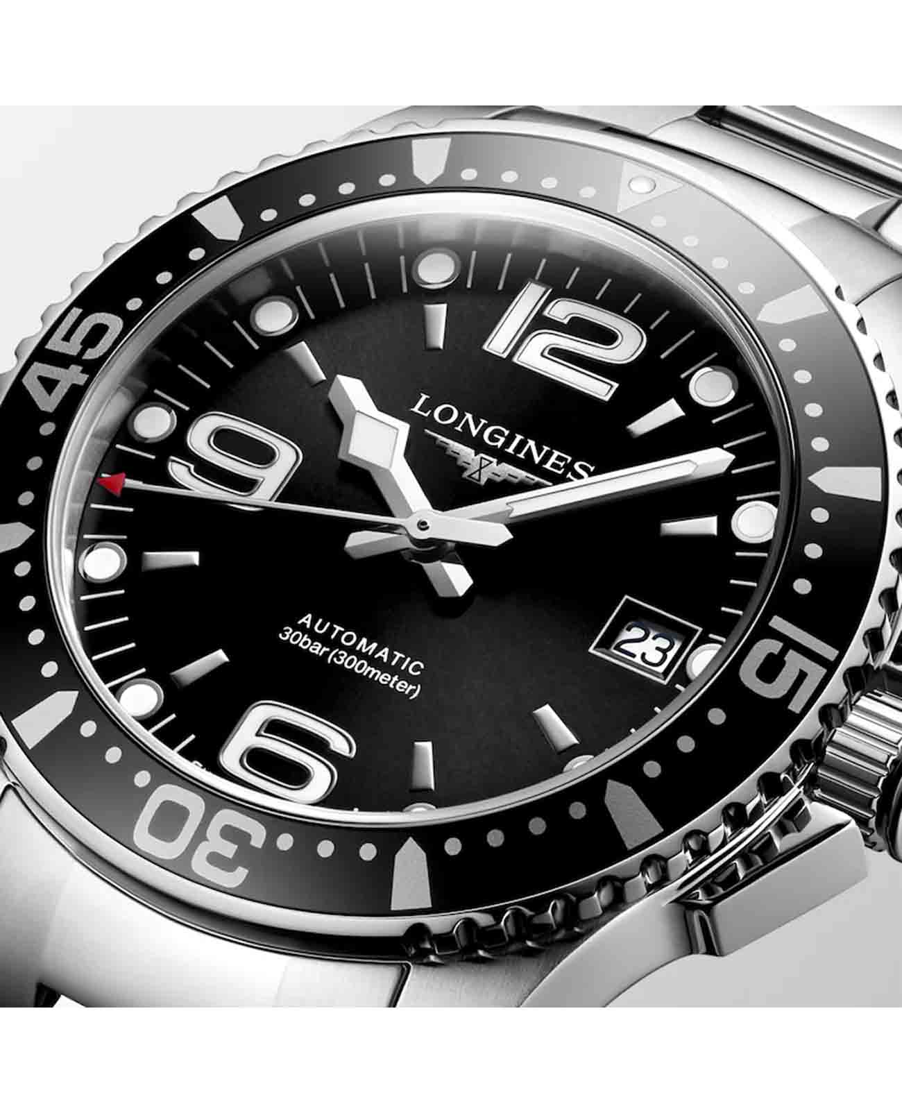Мужские механические швейцарские часы с автоподзаводом Longines HydroConquest L3.781.3.96.7. Сапфировое стеклоСапфировое стеклоПрочный и надёжный материал из кристалла сапфира синтетического происхождения, характеризующийся особой твёрдостью и устойчивостью к царапинам и повреждениям. с антибликовым покрытием, устойчивое к мелким механическим повреждениям. Корпус часов изготовлен из нержавеющей стали. Вращающийся стальной безельБезельВнешний ободок, закрепляющий стекло. В спортивных часах так называется поворотное кольцо с делениями на циферблате, выполняет роль таймера – замеряет отрезки времени на шкале. Неподвижный безель – элемент декора. Однонаправленно вращающийся безель на дайверских часах позволяет фиксировать моменты погружения и выныривания на поверхность. с люминесцентным покрытиемЛюминесцентное покрытиеПозволяет считывать показания времени в темноте. Производители наносят на стрелки, часовые индексы, безель или поверхность циферблата светонакопительный состав, дающий холодное свечение. Superluminova из нержавеющей стали и керамики, защищенный от царапин, никогда не изнашивается и не выцветает. Стрелки и метки с люминесцентным покрытиемЛюминесцентное покрытиеПозволяет считывать показания времени в темноте. Производители наносят на стрелки, часовые индексы, безель или поверхность циферблата светонакопительный состав, дающий холодное свечение.. Окошко даты находится в положении 3 часа. Класс водозащиты: 300 метров, позволит плавать, нырять и заниматься другими водными видами спорта. Стальной браслет на раскладной застёжкеРаскладная застёжкаТакой тип застёжки используется только на браслетах из металла. Она никогда не раскрывается полностью, происходит разделение на 2 и более частей. Раскладывающая застёжка снизит вероятность потери часов к минимуму. с удлинением для дайверов.