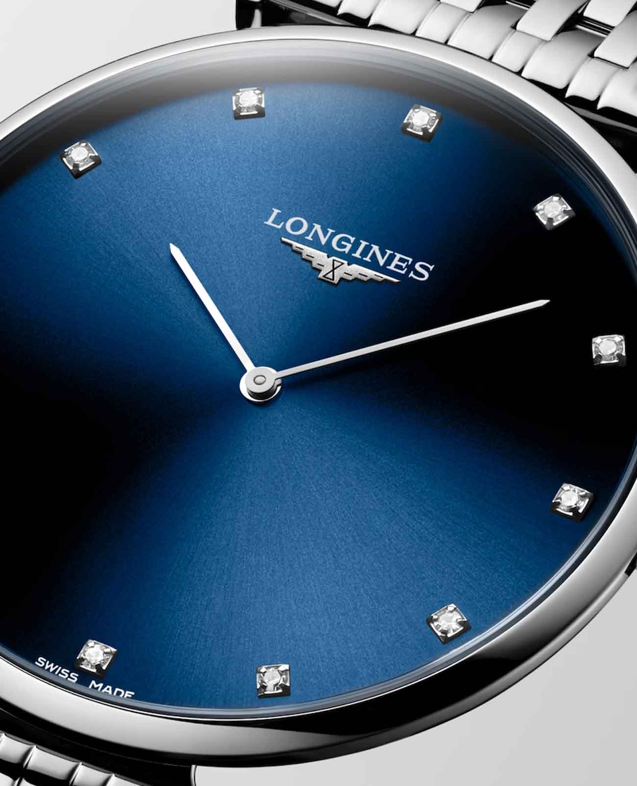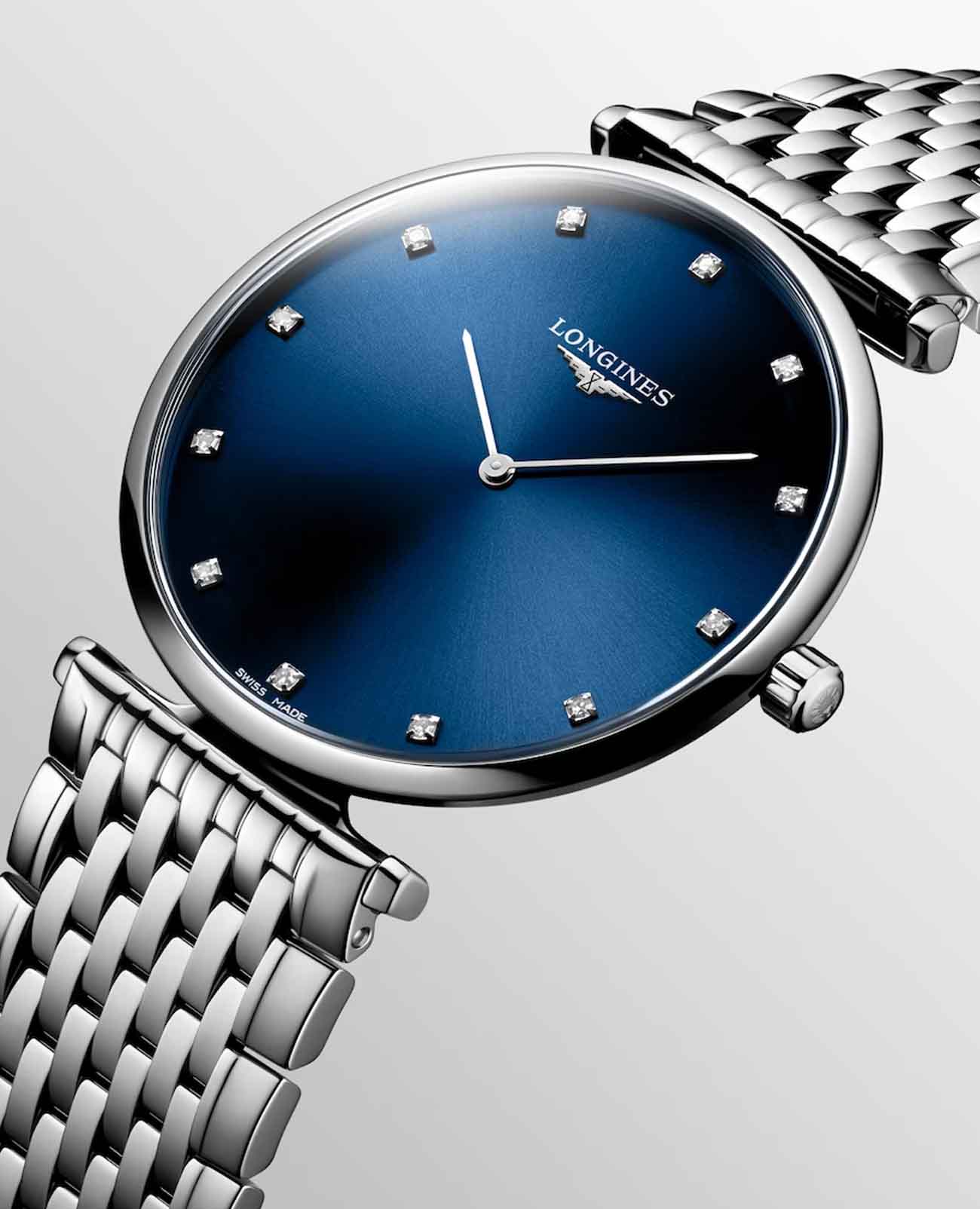 Женские швейцарские часы Longines La Grande Classique l4.866.4.97.6, кварцевый механизм с высокой точностью. Сапфировое стеклоСапфировое стеклоПрочный и надёжный материал из кристалла сапфира синтетического происхождения, характеризующийся особой твёрдостью и устойчивостью к царапинам и повреждениям. устойчивое к появлению царапин, обладающее высокой прозрачностью. Корпус часов изготовлен из стали. Циферблат с 12 бриллиантами группы Top Wesselton VS-SI общим весом 0.081 карата. Класс водозащиты: 30 метров, позволит защитить корпус от случайных брызг или капель дождя. Стальной браслет на застёжке-бабочке с кнопкамиЗастёжка "бабочка"Такой вид застёжки дополняется предохранителями, помогающими избежать случайного раскрытия браслета. Обладают изящным исполнением. .