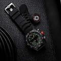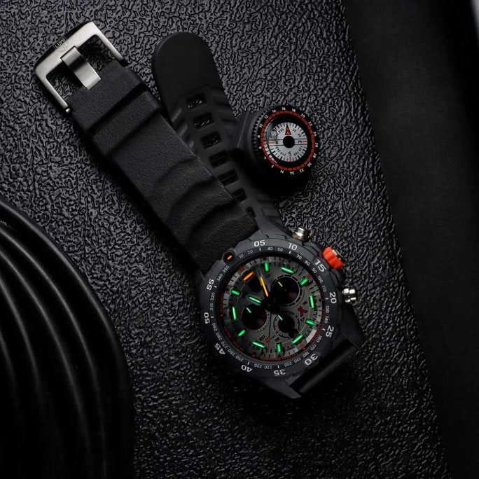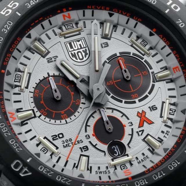 Мужские наручные часы-хронографХронографФункция позволяет измерять отрезки времени с особой точностью: часы, минуты, секунды. Верным признаком хронографа является наличие на циферблате 3 дополнительных окошек-счётчиков. Luminox Bear Grylls Survival Series XB.3748 разработаны для любителей активного образа жизни и экстремальных условий. Эти часы созданы в сотрудничестве с Беаром Гриллсом, известным путешественником и специалистом по выживанию в экстремальных условиях. Модель оборудована кварцевым механизмом Ronda 5030.D, предоставляющим надежность и точность показаний. Корпус, выполненный из пластика, усиленного карбоном, обеспечивает легкость и прочность, а серый циферблат защищен сапфировым стекломСапфировое стеклоПрочный и надёжный материал из кристалла сапфира синтетического происхождения, характеризующийся особой твёрдостью и устойчивостью к царапинам и повреждениям. с антибликовым покрытиемАнтибликовое покрытиеСлой оксида металла в 0,13-0,3 микрон, благодаря которому стекло часов не бликует и не отражает свет. Антибликовое покрытие уменьшает отражение света в 10 раз, обеспечивая отличную читаемость показателей циферблата.. Часы обладают функцией хронографаХронографФункция позволяет измерять отрезки времени с особой точностью: часы, минуты, секунды. Верным признаком хронографа является наличие на циферблате 3 дополнительных окошек-счётчиков. с секундомеромСекундомерСекундоме́р — прибор, способный измерять интервалы времени с точностью до долей секунды., позволяющим измерять короткие промежутки времени, а также показывают время в 12-ти и 24-х часовом формате. Счетчик регистрирует секунды, минуты и часы, а центральная секундная стрелка используется как секундная стрелка секундомера. Специальная технология LLTLLTLLT — это автономный механизм подсветки, основанный на использовании микроскопических газонаполненных элементов. Специальные герметичные капсулы из боросиликатного стекла, интегрированные в циферблат, генерируют свечение без необходимости подключения к внешним источникам энергии. Для их работы не требуется ни дополнительный свет, ни механическое воздействие (например, нажатие кнопки). Свечение возникает благодаря химическому процессу: реакция между тритием, заключенным в капсулах, и люминофорным покрытием создает стабильное автономное освещение. Технология обеспечивает энергетическую независимость и долговечность подсветки. обеспечивает непревзойденную ночную видимость на протяжении 25 лет. Водозащита уровня 300WR позволяет использовать часы в условиях высокой влажности и при погружениях. Окошко даты расположено в позиции 6 часов, а вращающийся в одном направлении безельБезельВнешний ободок, закрепляющий стекло. В спортивных часах так называется поворотное кольцо с делениями на циферблате, выполняет роль таймера – замеряет отрезки времени на шкале. Неподвижный безель – элемент декора. Однонаправленно вращающийся безель на дайверских часах позволяет фиксировать моменты погружения и выныривания на поверхность. имеет светящуюся метку на 12 часов. Завинчивающаяся заводная головка с защитой и оранжевым прорезиненным кольцом обеспечивает надежное сцепление, что особенно важно для подводных работ. На завинчивающейся стальной задней крышке выгравированы надпись «Never Give Up» и автограф Беара Гриллса, что подч