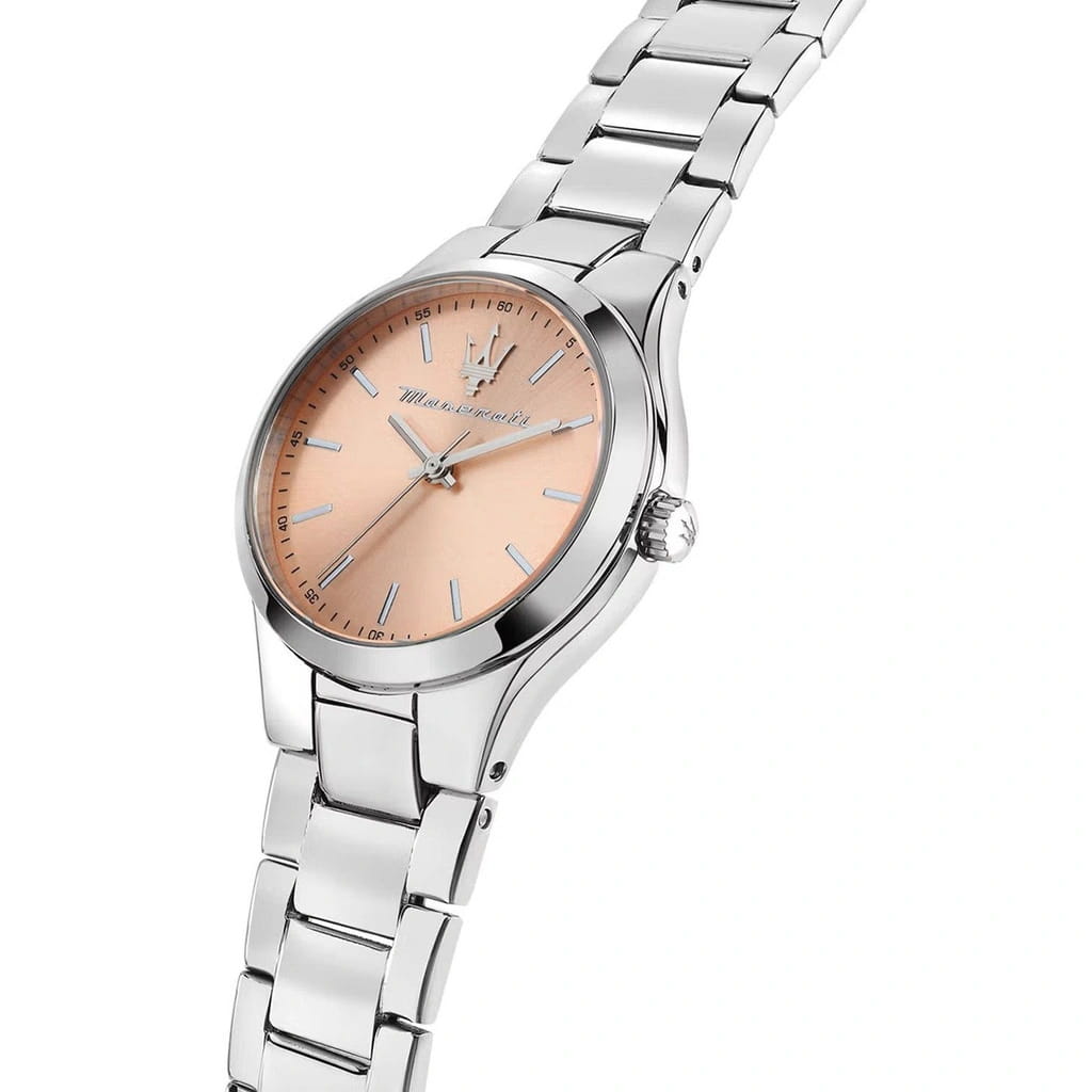 Maserati Attrazione R8853151507 — воплощение стиля и функциональности для современных женщин, ценящих качество и элегантность. Корпус диаметром 30 мм выполнен из нержавеющей стали, обеспечивая прочность и долговечность.Минеральное стеклоМинеральное стеклоМинеральное стекло представляет собой искусственно выращенный минерал кварца. Такое стекло отличается особой устойчивостью к повреждениям и царапинам. Уступает по некоторым качествам сапфировому стеклу. надежно защищает синий циферблат с изящными рисками, придавая часам утонченный вид. Благодаря водостойкости до 50 метров (50 АТМ), эти часы станут вашим надежным спутником в любых условиях, будь то деловая встреча или активный отдых. Завершающий штрих — стальной браслет с раскладной застёжкойРаскладная застёжкаТакой тип застёжки используется только на браслетах из металла. Она никогда не раскрывается полностью, происходит разделение на 2 и более частей. Раскладывающая застёжка снизит вероятность потери часов к минимуму., который подчеркивает общий стиль, обеспечивая комфорт и надежность в носке. Метки в виде штрихов. Maserati Attrazione — это стильный аксессуар, отражающий итальянскую элегантность и внимание к деталям.