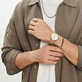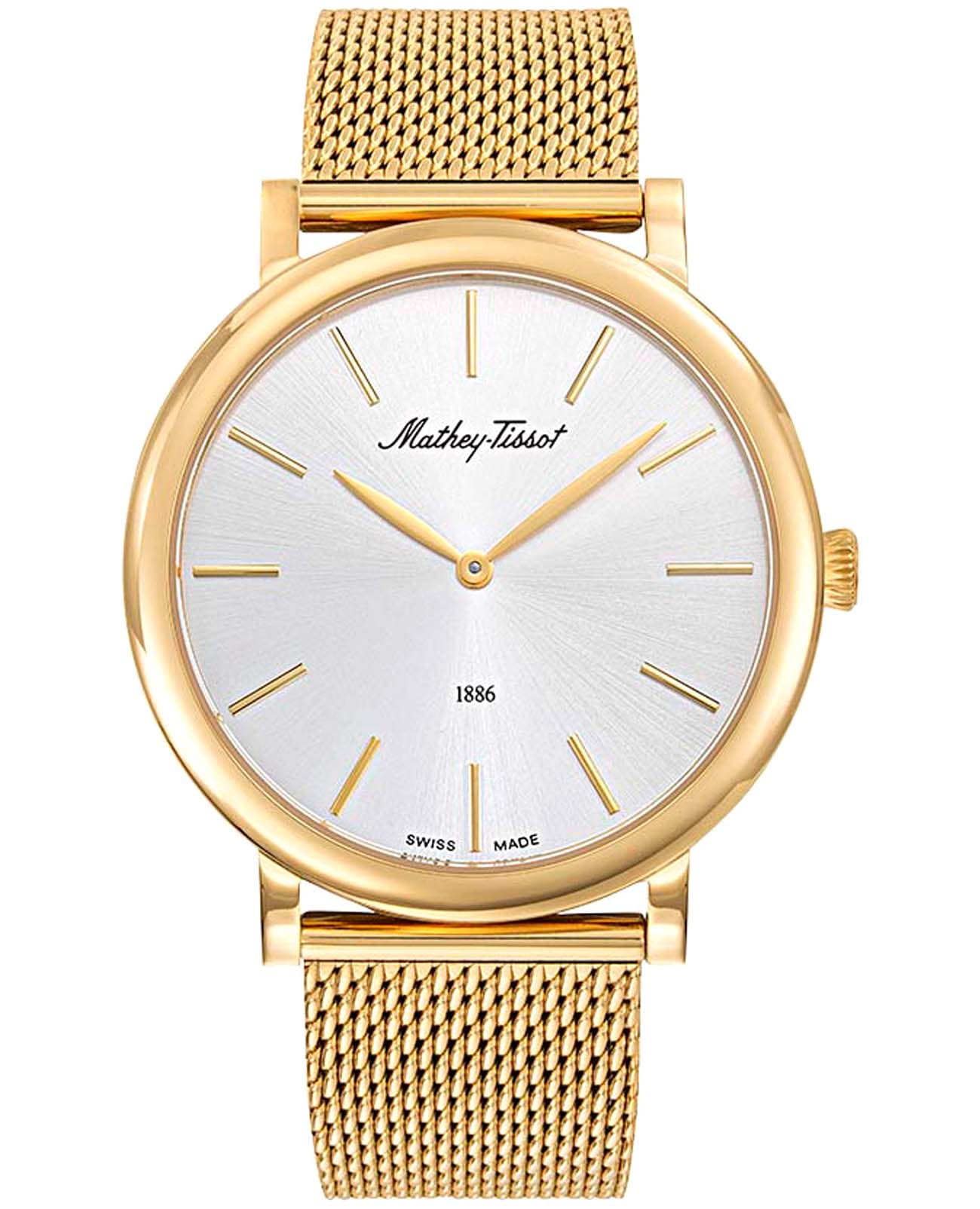 Мужские кварцевые часы Mathey-Tissot Monsoon H7916PYS — это стильное сочетание элегантности и современного дизайна. Изящный корпус выполнен из нержавеющей стали с PVD-покрытиемPVDУльтратонкое покрытие наносится в технике вакуумного напыления, сочетает в себе нитрид титана особой прочности со слоем золота или оксида хрома. Несёт в себе декоративную или защитную функцию. золотистого цвета, диаметром 40 мм, что придаст образу элегантности и надежности. Изысканный циферблат с метками в виде штрихов придает модели особый блеск. Циферблат выполнен по технологии Sunray (солнечные лучи) и защищен минеральным стекломМинеральное стеклоМинеральное стекло представляет собой искусственно выращенный минерал кварца. Такое стекло отличается особой устойчивостью к повреждениям и царапинам. Уступает по некоторым качествам сапфировому стеклу. с сапфировым покрытием, обеспечивает устойчивость к царапинам. Часы оснащены надежным кварцевым механизмом. Стальной браслет с PVD-покрытиемPVDУльтратонкое покрытие наносится в технике вакуумного напыления, сочетает в себе нитрид титана особой прочности со слоем золота или оксида хрома. Несёт в себе декоративную или защитную функцию. миланского плетения на раскладном замкеРаскладная застёжкаТакой тип застёжки используется только на браслетах из металла. Она никогда не раскрывается полностью, происходит разделение на 2 и более частей. Раскладывающая застёжка снизит вероятность потери часов к минимуму., гарантирует комфортное и безопасное ношение. Класс водозащиты: 50 метров позволит защитить корпус от случайных брызг или капель дождя. Mathey-Tissot — отличный выбор для тех, кто ценит утонченность и качество.
