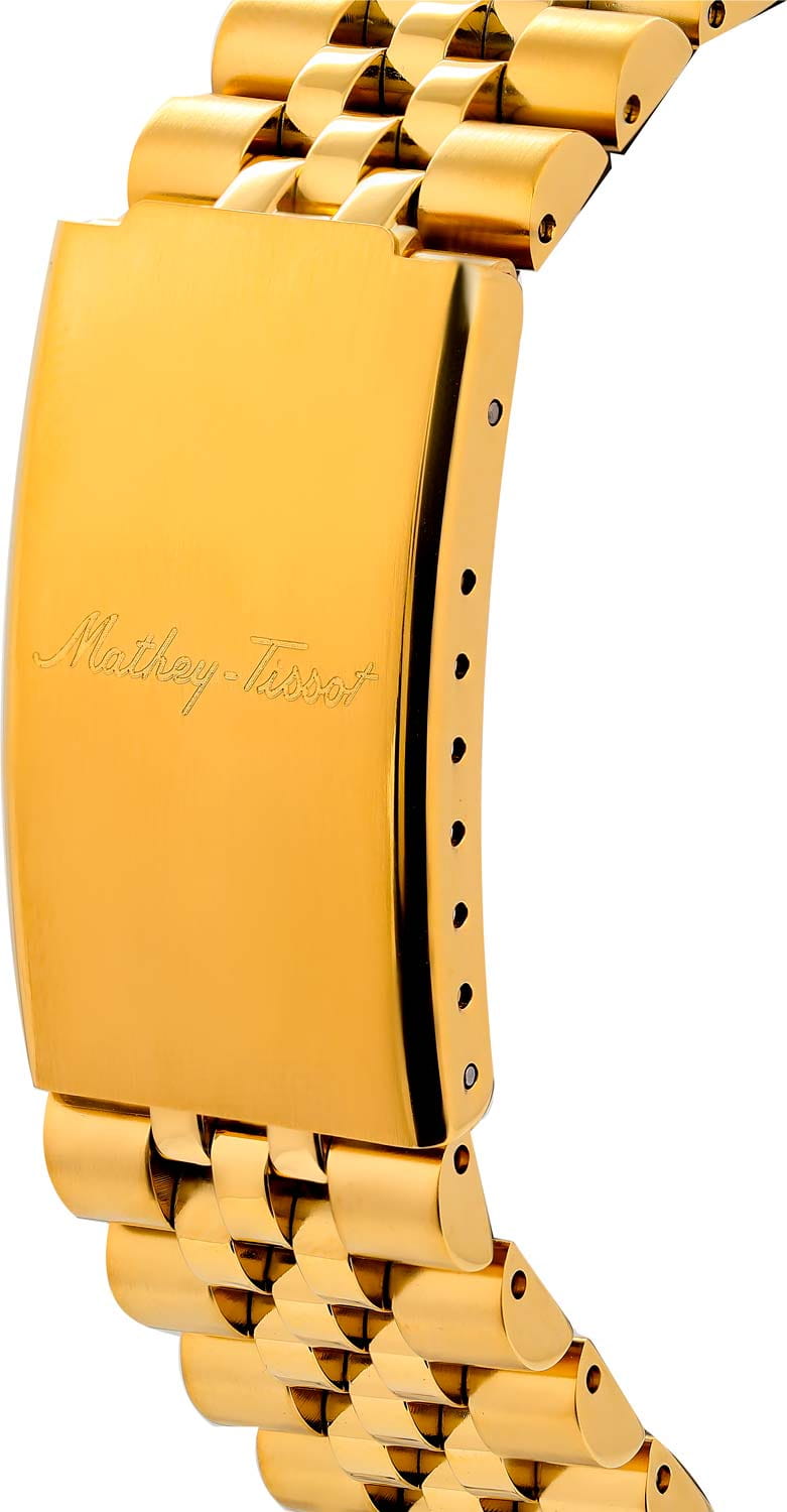 Мужские кварцевые часы Mathey-Tissot Rolly H810PN — это стильное сочетание элегантности и современного дизайна. Изящный корпус выполнен из нержавеющей стали с PVD-покрытиемPVDУльтратонкое покрытие наносится в технике вакуумного напыления, сочетает в себе нитрид титана особой прочности со слоем золота или оксида хрома. Несёт в себе декоративную или защитную функцию. золотистого цвета, диаметром 40 мм, что придаст образу элегантности и надежности. Изысканный циферблат с метками в виде штрихов придает модели особый блеск. Циферблат защищен минеральным стекломМинеральное стеклоМинеральное стекло представляет собой искусственно выращенный минерал кварца. Такое стекло отличается особой устойчивостью к повреждениям и царапинам. Уступает по некоторым качествам сапфировому стеклу., обеспечивающий устойчивость к царапинам. Стрелки и метки с люминесцентным покрытиемЛюминесцентное покрытиеПозволяет считывать показания времени в темноте. Производители наносят на стрелки, часовые индексы, безель или поверхность циферблата светонакопительный состав, дающий холодное свечение.. Окошко даты находится в положении 3 часа. Часы оснащены надежным кварцевым механизмом. Стальной браслет с PVD-покрытиемPVDУльтратонкое покрытие наносится в технике вакуумного напыления, сочетает в себе нитрид титана особой прочности со слоем золота или оксида хрома. Несёт в себе декоративную или защитную функцию. на раскладной застёжкеРаскладная застёжкаТакой тип застёжки используется только на браслетах из металла. Она никогда не раскрывается полностью, происходит разделение на 2 и более частей. Раскладывающая застёжка снизит вероятность потери часов к минимуму., гарантирует комфортное и безопасное ношение. Класс водозащиты: 50 метров позволит защитить корпус от случайных брызг или капель дождя. Mathey-Tissot  — отличный выбор для тех, кто ценит утонченность и качество.