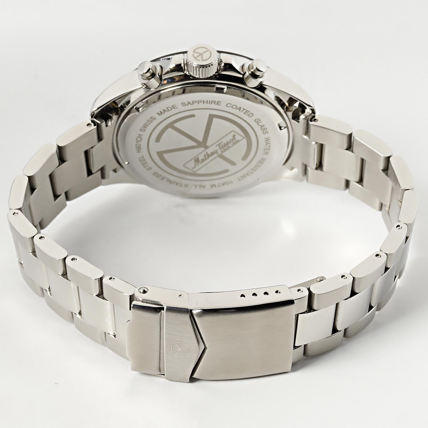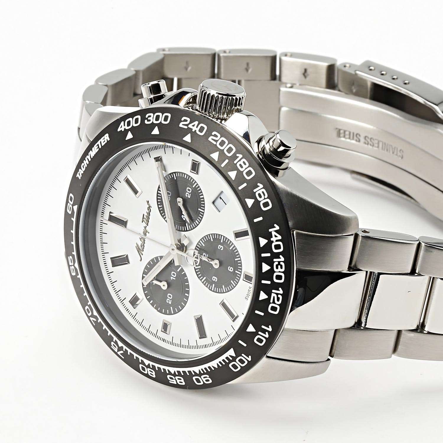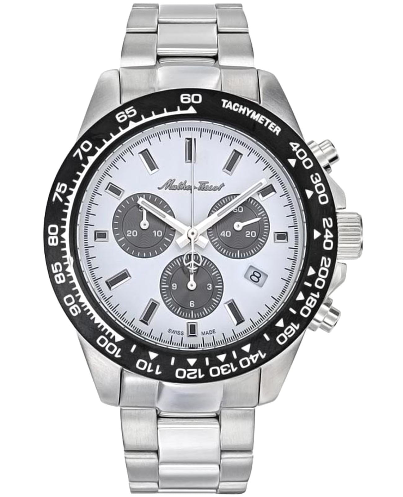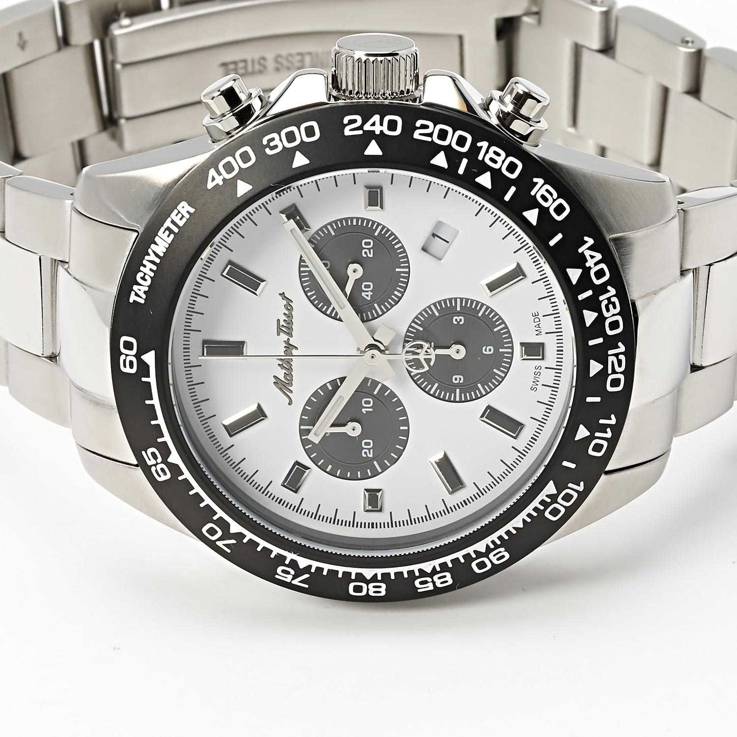 Мужские кварцевые часы-хронографХронографФункция позволяет измерять отрезки времени с особой точностью: часы, минуты, секунды. Верным признаком хронографа является наличие на циферблате 3 дополнительных окошек-счётчиков. Mathey-Tissot Mathy H9010CHAI — это стильное сочетание элегантности и современного дизайна. Изящный корпус выполнен из нержавеющей стали, диаметром 42 мм, что придаст образу элегантности и надежности. Изысканный циферблат с метками в виде штрихов придает модели особый блеск. Циферблат защищен минеральным стекломМинеральное стеклоМинеральное стекло представляет собой искусственно выращенный минерал кварца. Такое стекло отличается особой устойчивостью к повреждениям и царапинам. Уступает по некоторым качествам сапфировому стеклу. с сапфировым покрытием, обеспечивает устойчивость к царапинам. Стрелки и метки с люминесцентным покрытиемЛюминесцентное покрытиеПозволяет считывать показания времени в темноте. Производители наносят на стрелки, часовые индексы, безель или поверхность циферблата светонакопительный состав, дающий холодное свечение.. Шкала тахиметраТахиметрРазмеченная шкала, располагается на ободке или безеле часов. Тахиметр позволяет рассчитать скорость на определённом участке пути, расстояние измеряется в километрах или милях. на безелеБезельВнешний ободок, закрепляющий стекло. В спортивных часах так называется поворотное кольцо с делениями на циферблате, выполняет роль таймера – замеряет отрезки времени на шкале. Неподвижный безель – элемент декора. Однонаправленно вращающийся безель на дайверских часах позволяет фиксировать моменты погружения и выныривания на поверхность. с PVD-покрытиемPVDУльтратонкое покрытие наносится в технике вакуумного напыления, сочетает в себе нитрид титана особой прочности со слоем золота или оксида хрома. Несёт в себе декоративную или защитную функцию.. Окошко даты находится в положении 4 часа. Стальной браслет на раскладной застёжке с фиксаторомРаскладная застёжкаТакой тип застёжки используется только на браслетах из металла. Она никогда не раскрывается полностью, происходит разделение на 2 и более частей. Раскладывающая застёжка снизит вероятность потери часов к минимуму., гарантирует комфортное и безопасное ношение. Рифленая заводная головка. Класс водозащиты: 100 метров позволит плавать, нырять и заниматься другими водными видами спорта. Mathey-Tissot  — отличный выбор для тех, кто ценит утонченность и качество.