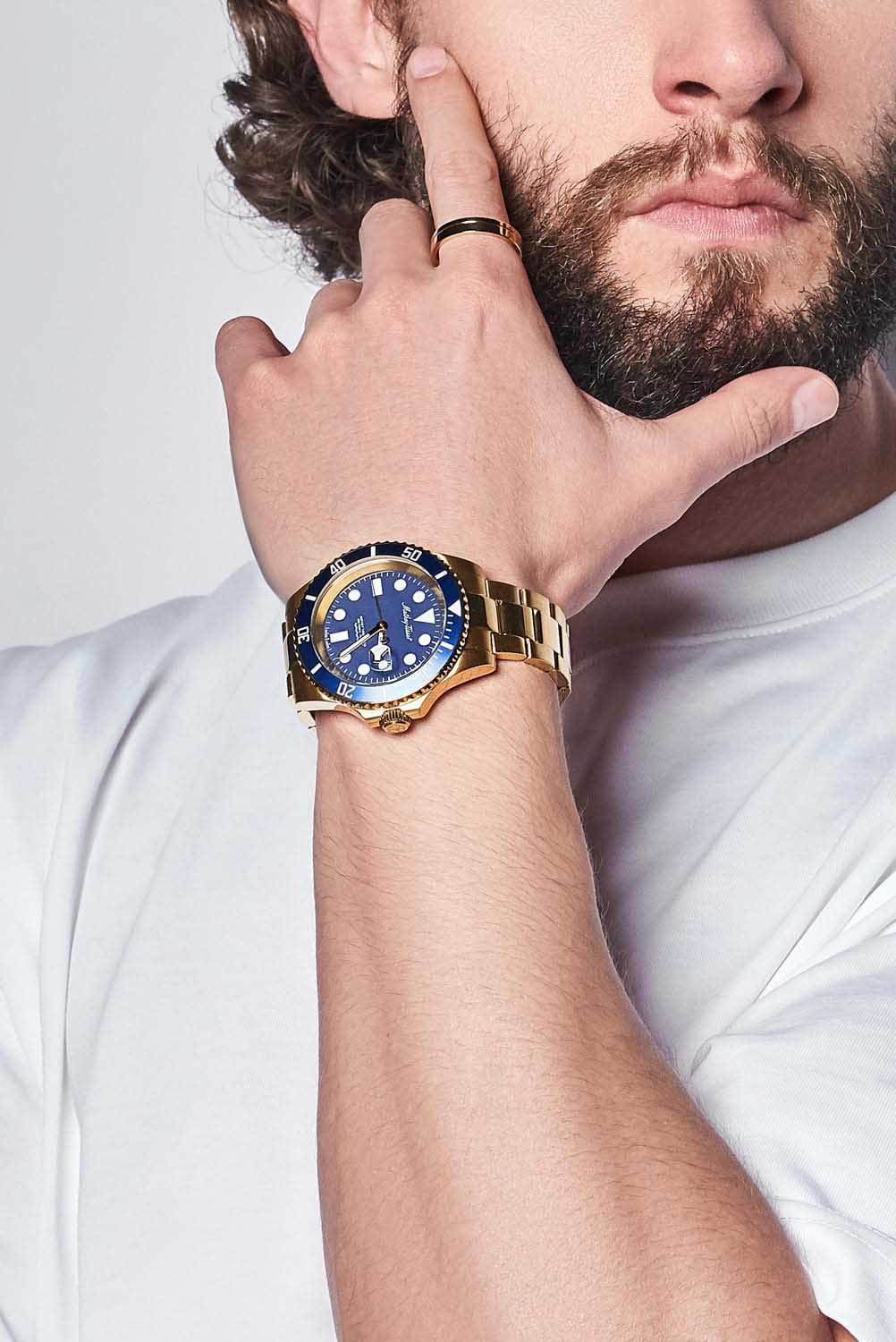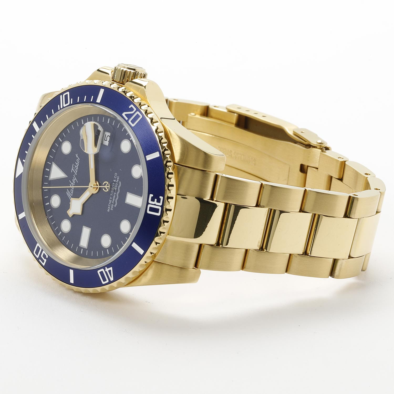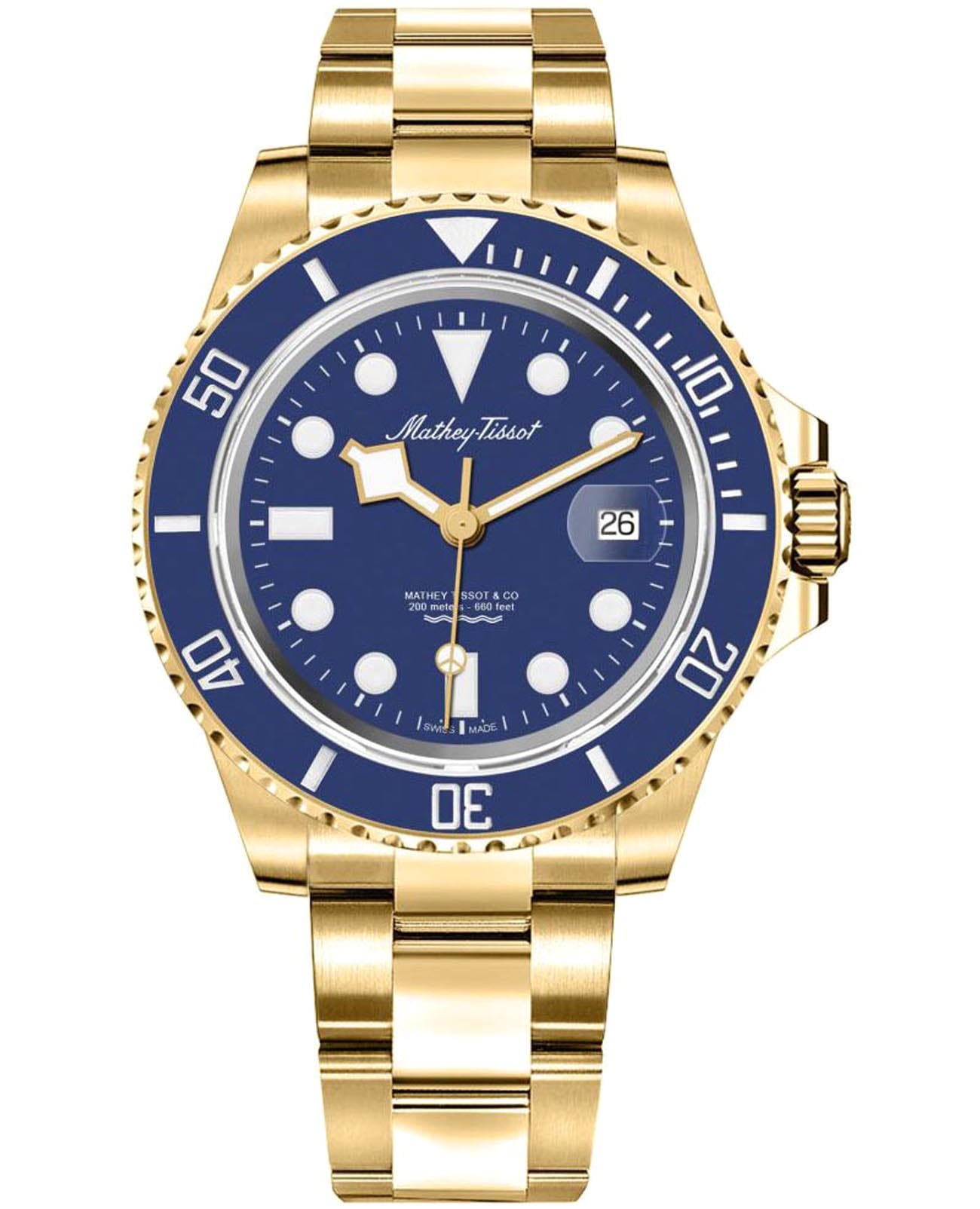 Мужские кварцевые часы Mathey-Tissot Mathy H906PBU — это стильное сочетание элегантности и современного дизайна. Изящный корпус выполнен из нержавеющей стали с PVD-покрытиемPVDУльтратонкое покрытие наносится в технике вакуумного напыления, сочетает в себе нитрид титана особой прочности со слоем золота или оксида хрома. Несёт в себе декоративную или защитную функцию. золотистого цвета, диаметром 43,5 мм, что придаст образу элегантности и надежности. Изысканный циферблат с метками в виде точек придает модели особый блеск. Циферблат защищен минеральным стекломМинеральное стеклоМинеральное стекло представляет собой искусственно выращенный минерал кварца. Такое стекло отличается особой устойчивостью к повреждениям и царапинам. Уступает по некоторым качествам сапфировому стеклу. с сапфировым покрытием, обеспечивает устойчивость к царапинам. БезельБезельВнешний ободок, закрепляющий стекло. В спортивных часах так называется поворотное кольцо с делениями на циферблате, выполняет роль таймера – замеряет отрезки времени на шкале. Неподвижный безель – элемент декора. Однонаправленно вращающийся безель на дайверских часах позволяет фиксировать моменты погружения и выныривания на поверхность. с PVD-покрытиемPVDУльтратонкое покрытие наносится в технике вакуумного напыления, сочетает в себе нитрид титана особой прочности со слоем золота или оксида хрома. Несёт в себе декоративную или защитную функцию. синего цвета. Стрелки и метки с люминесцентным покрытиемЛюминесцентное покрытиеПозволяет считывать показания времени в темноте. Производители наносят на стрелки, часовые индексы, безель или поверхность циферблата светонакопительный состав, дающий холодное свечение.. Окошко даты находится в положении 3 часа. Часы оснащены надежным кварцевым механизмом. Стальной браслет на раскладной застёжке с фиксаторомРаскладная застёжкаТакой тип застёжки используется только на браслетах из металла. Она никогда не раскрывается полностью, происходит разделение на 2 и более частей. Раскладывающая застёжка снизит вероятность потери часов к минимуму., гарантирует комфортное и безопасное ношение. Рифленая заводная головка. Класс водозащиты: 200 метров, позволит плавать нырять и заниматься другими водными видами спорта. Mathey-Tissot  — отличный выбор для тех, кто ценит утонченность и качество.